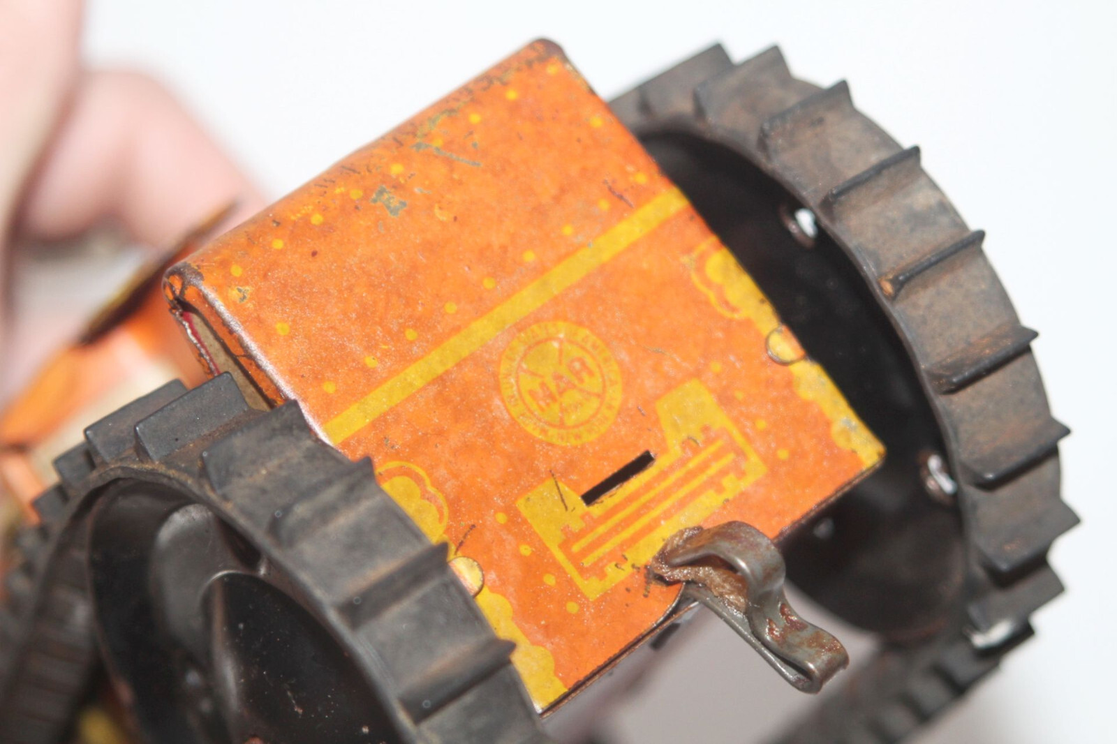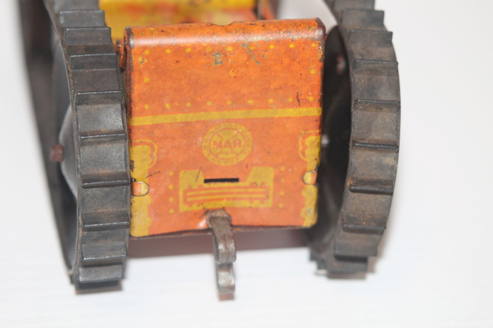 как выглядит Vintage Marx Tin Litho Bulldozer Wind-up Toy Orange Caterpillar Tractor WORKS фото