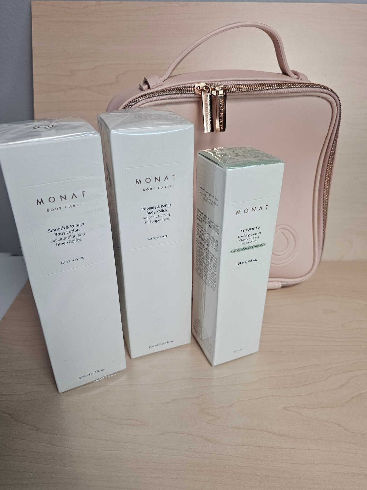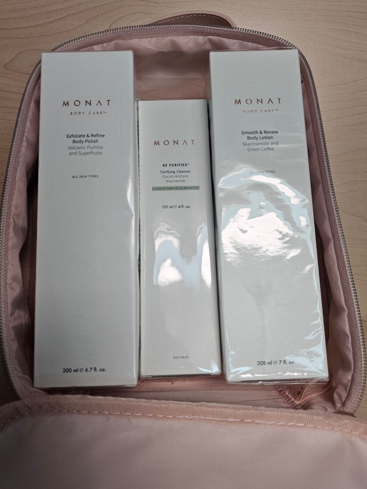 как выглядит 3 piece New Monat Body Skin Care set with Carry bag фото