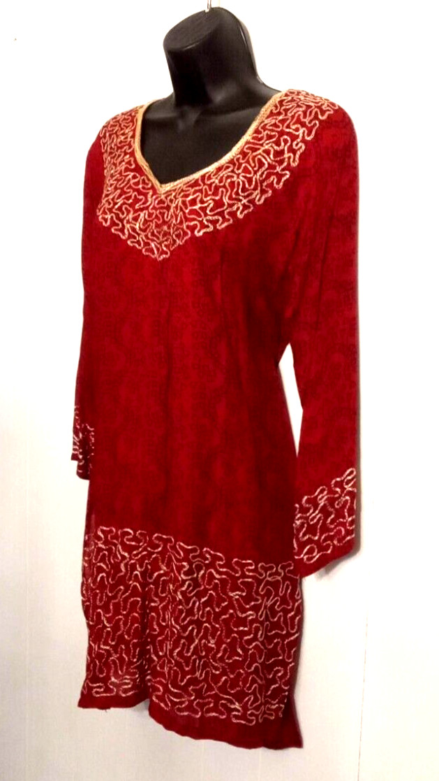Red Floral Print Embroidered Tunic Top size Large Kurta Shirt Short India Kurti