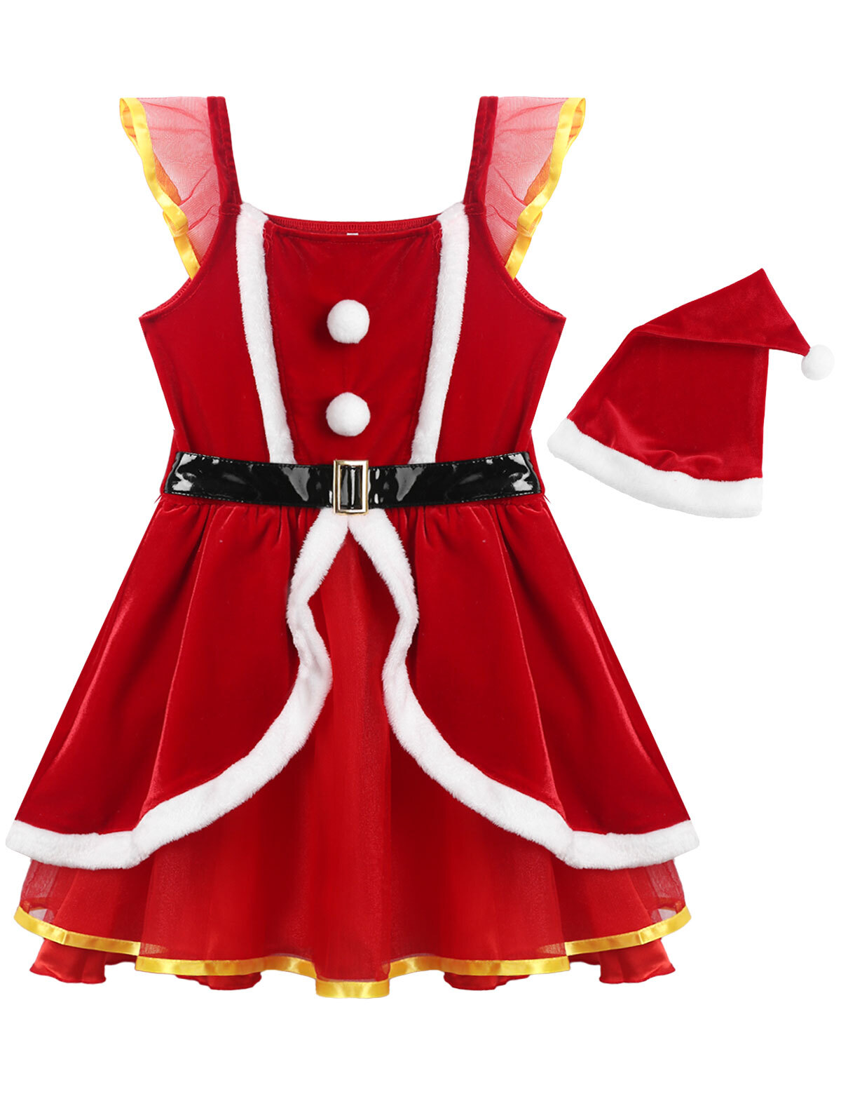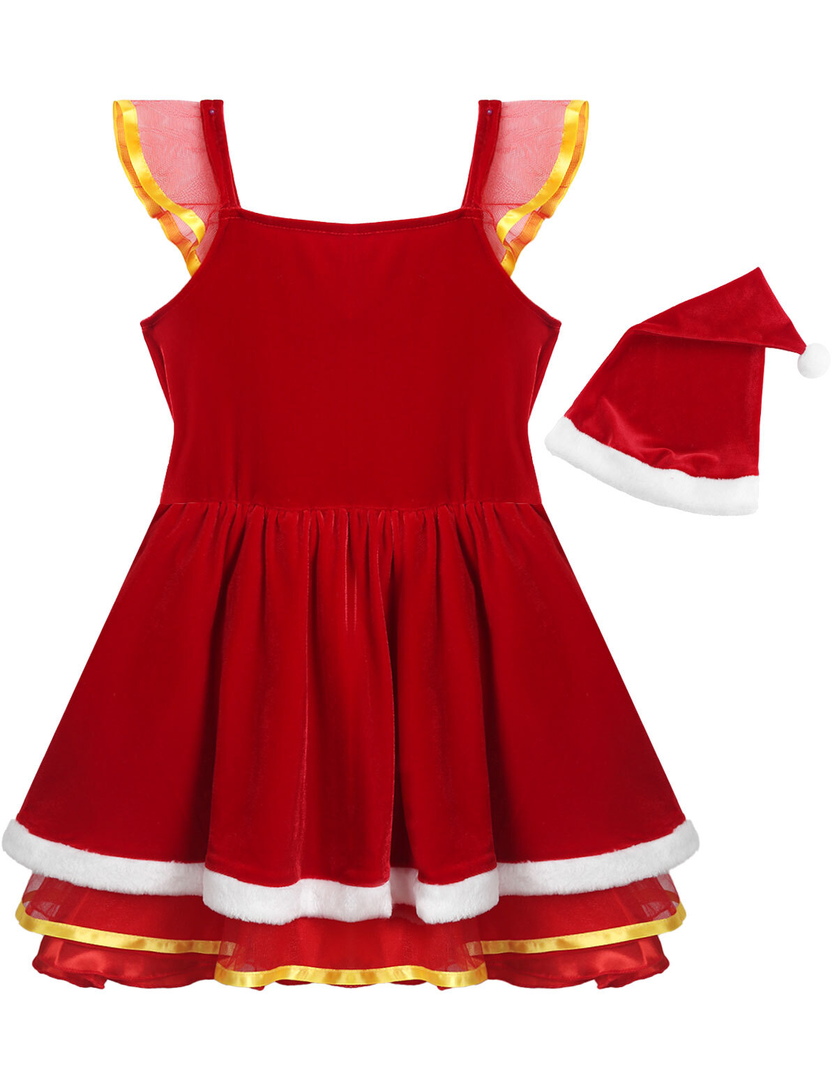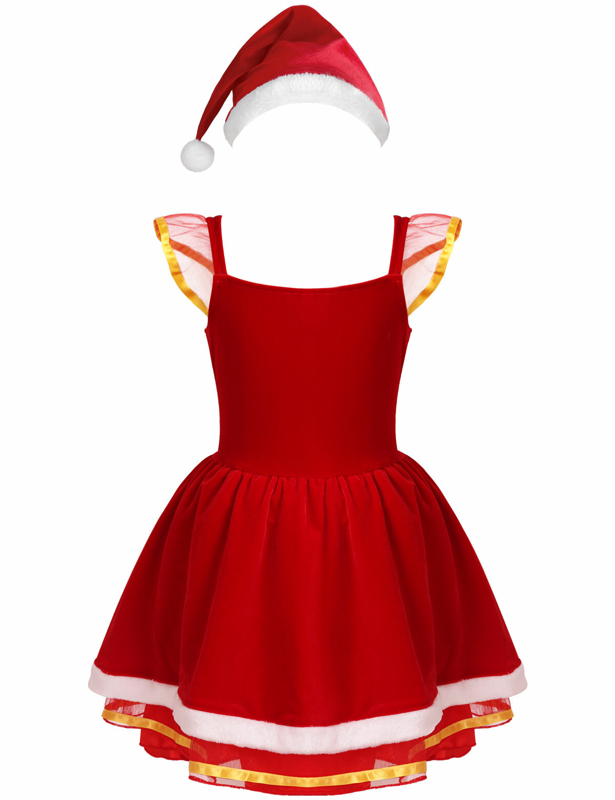 Girls Christmas Santa Costume Short Sleeve Striped Mesh Tutu Dress with Hat