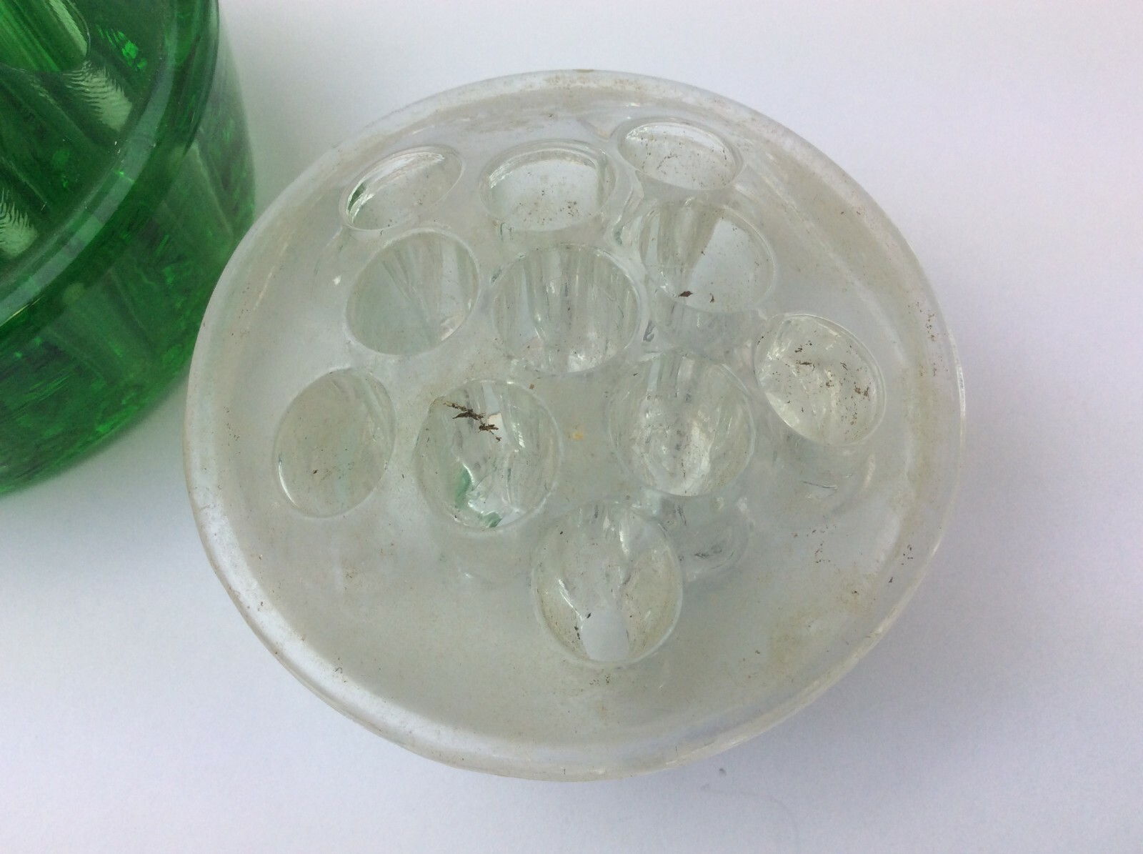 Two Vintage Used Glass Clear Green Flower Frogs Depression Era Flower Bouquet