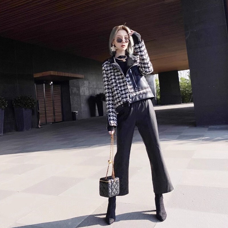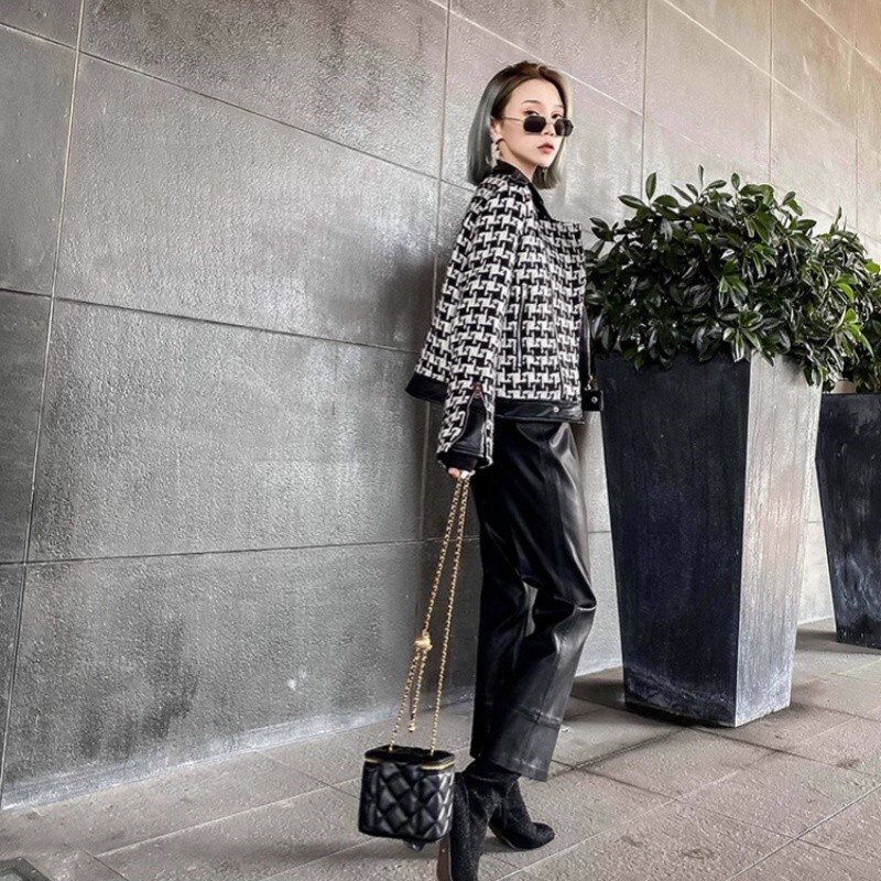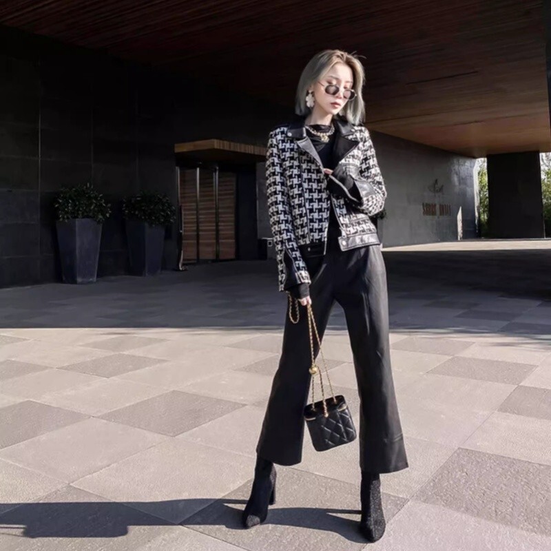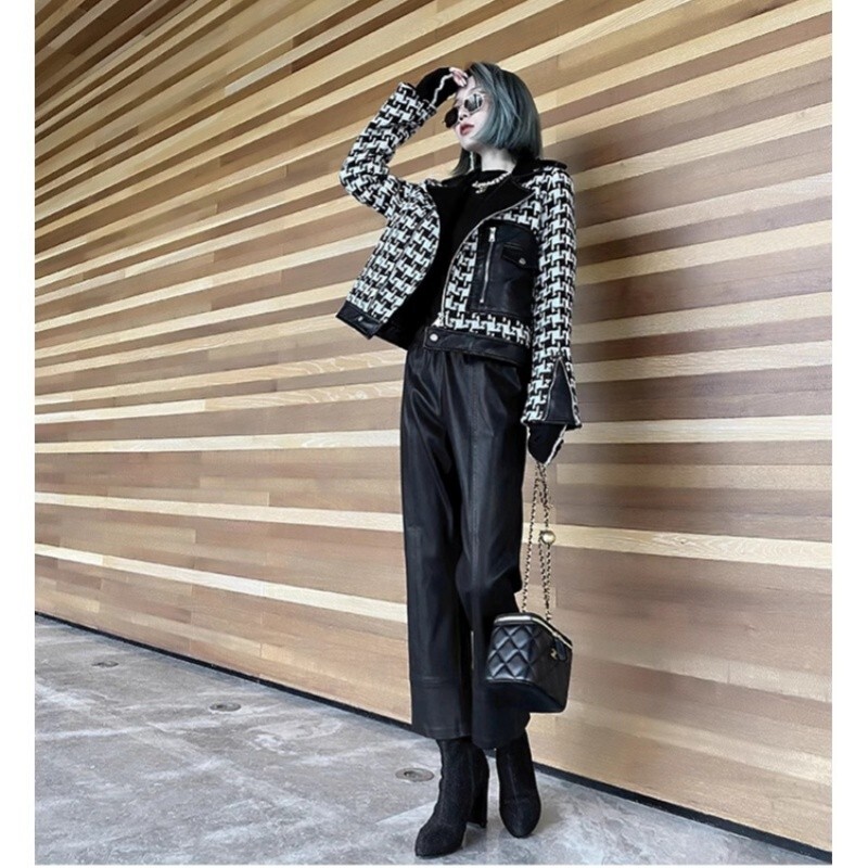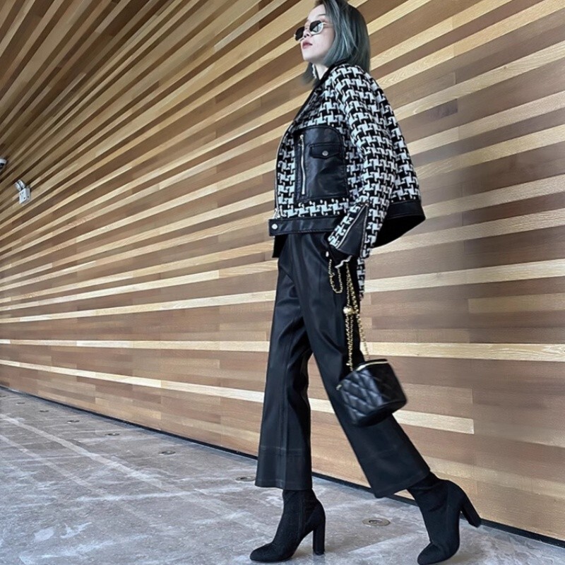 Korean women's fashionable high waisted wide leg pants flared pants loose PU pan