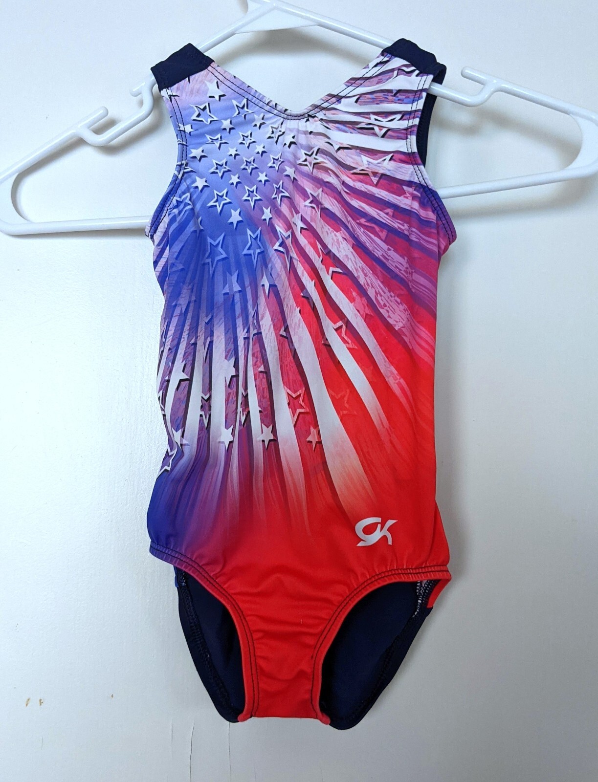 как выглядит GK Elite Gymnastics Leotard Allegiance Show Patriotic Stars Printed Size CS фото