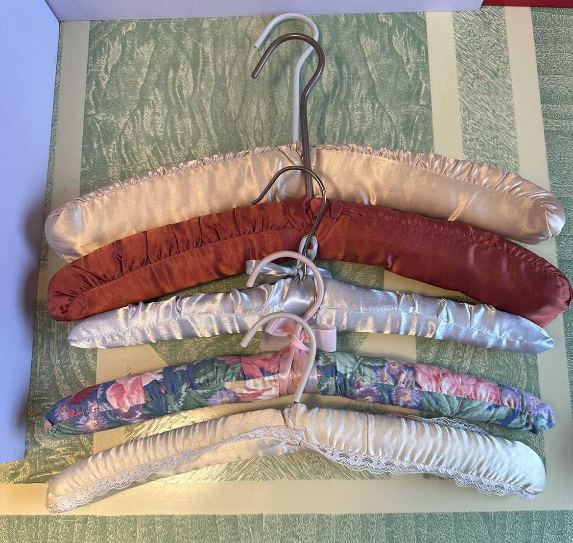 как выглядит Vtg MCM Padded Fabric Satin Covered Hangers 16 15 Lot Of 5 Bows Retro MCM 21 фото