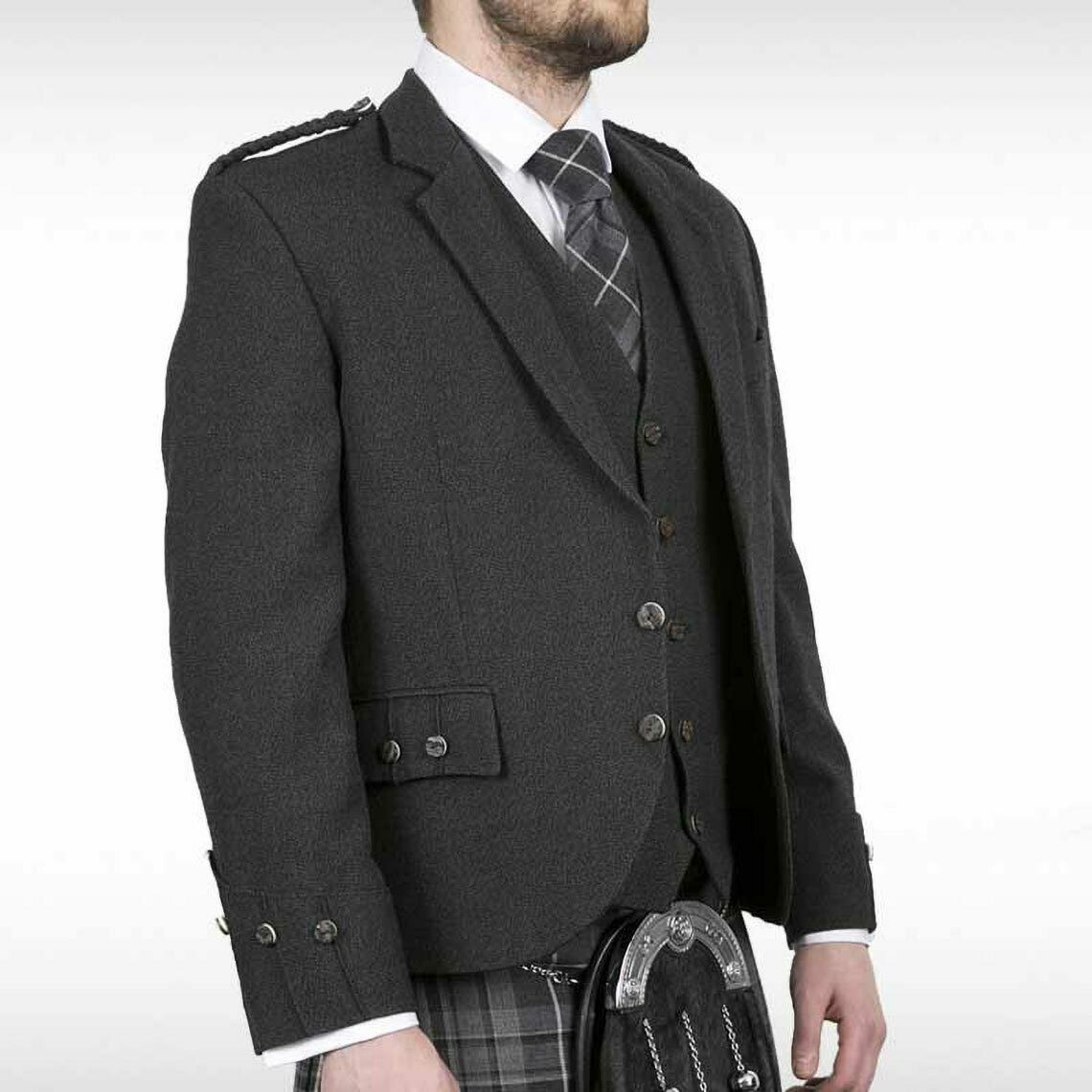 Scottish Charcoal Grey Tweed Wool Argyle Kilt Jacket With Vest