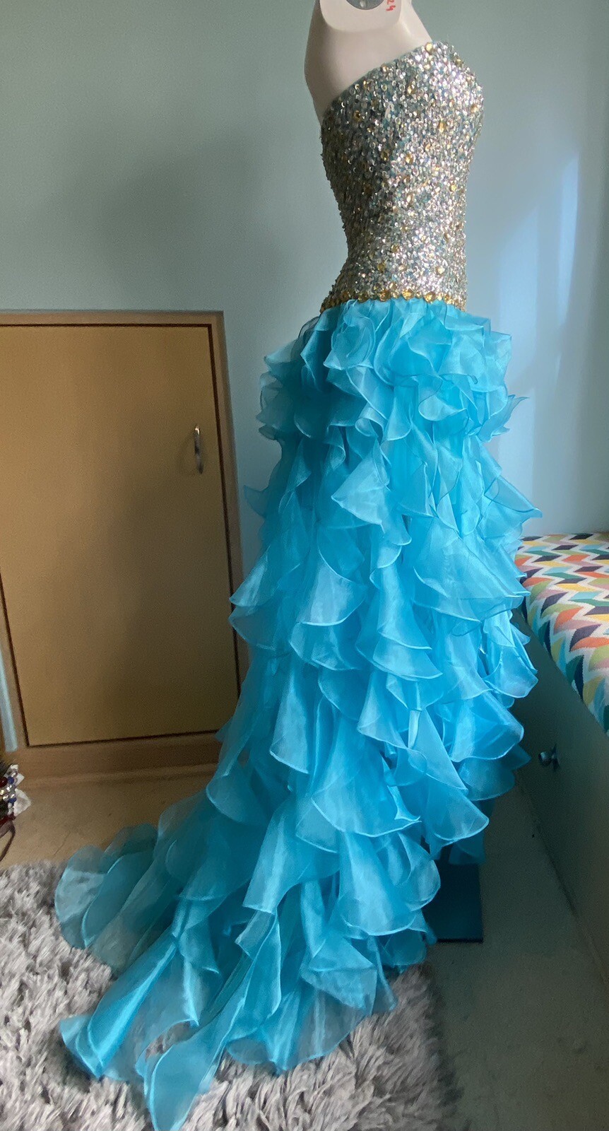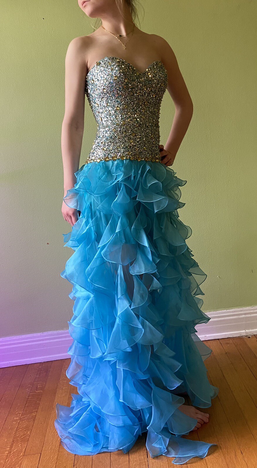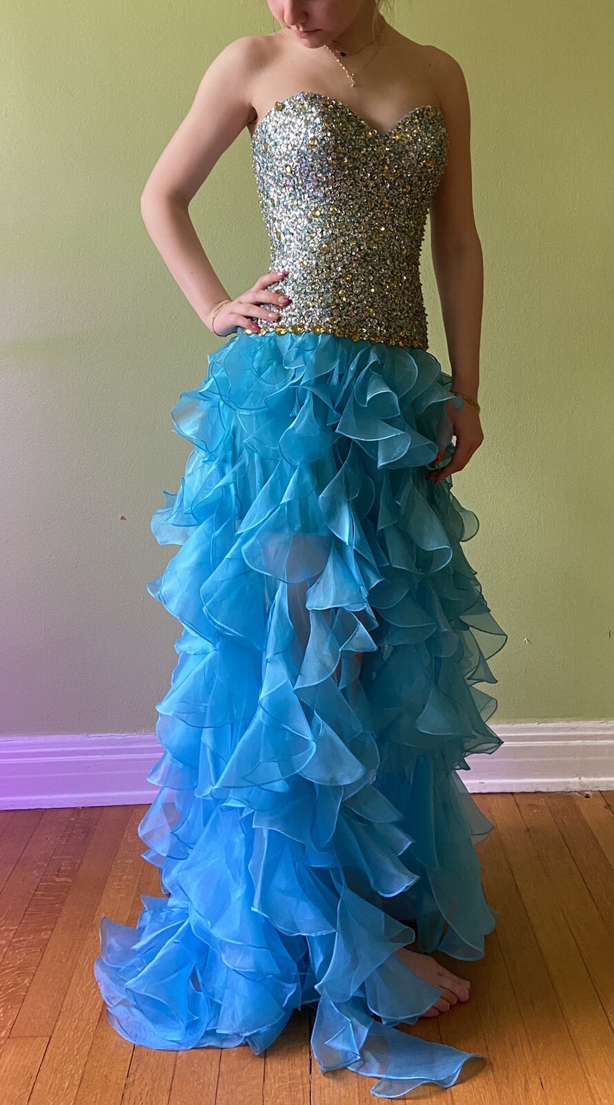 как выглядит Sherri Hill Sz 0 Strapless Prom Dress Formal Blue Jewelled Bodice Ruffled Skirt фото