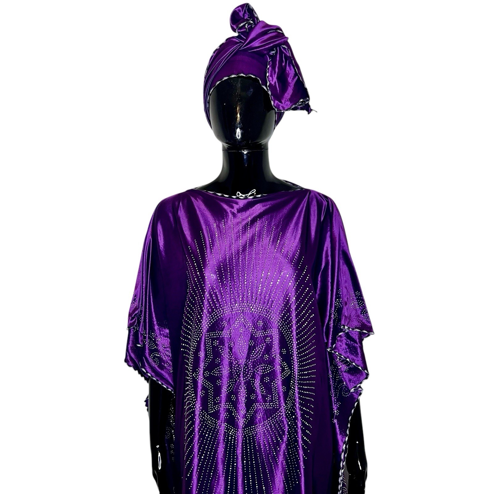 Shiny Purple Women African Loose Fit Embroidered Kaftan/ Agbada w/ Head Scarf