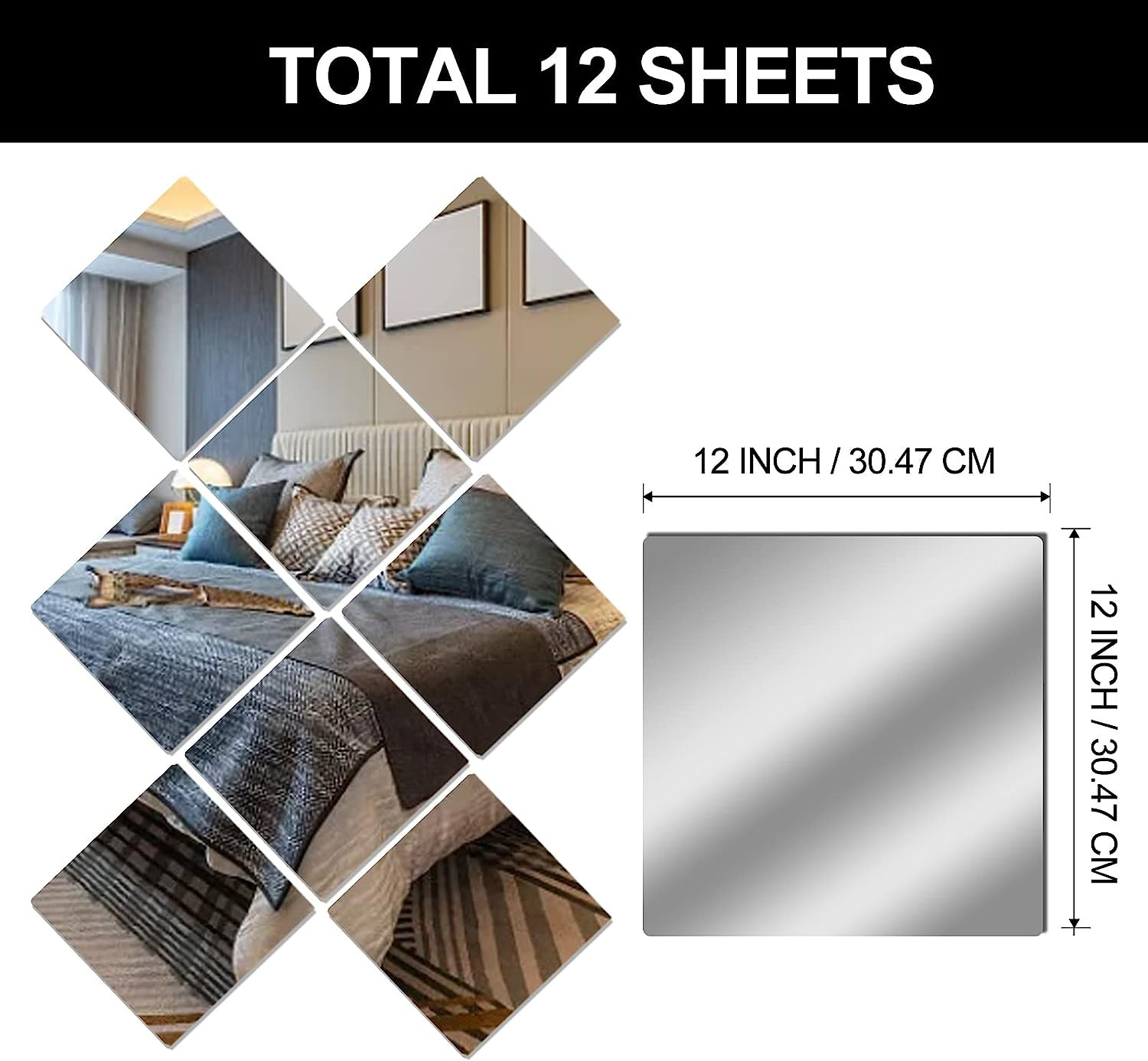 12 X 12 Acrylic Flexible Mirror Sheets, 12 Pack Self-Adhesive Mirror Tiles