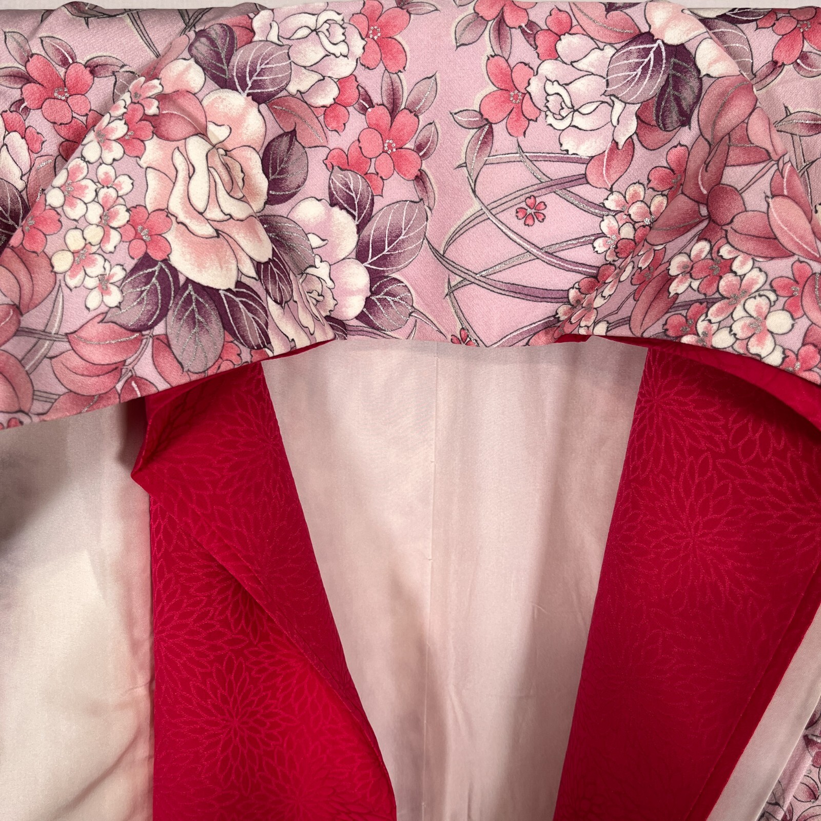 K91546 Japanese Kimono 100 Silk Komon Pink roses