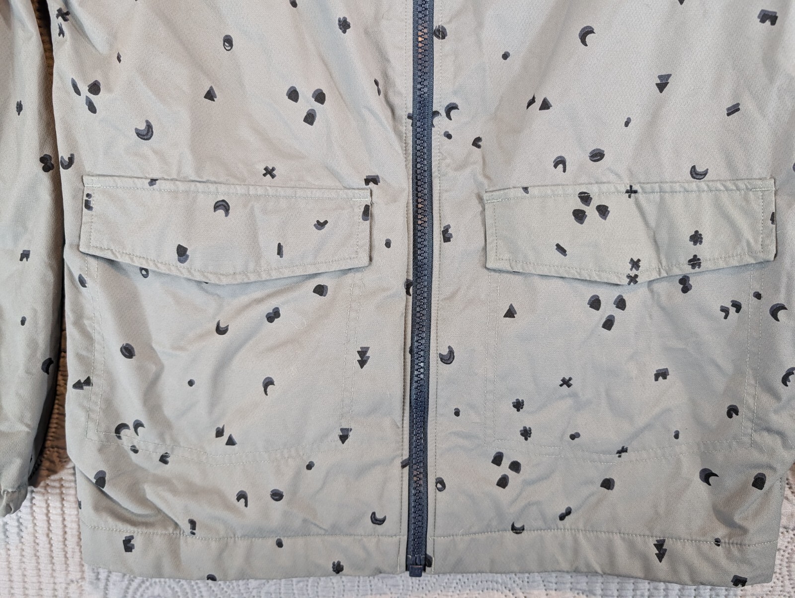 как выглядит REI CO-OP Rain Hooded Jacket Boys 14-16 Large Gray Black All Over Print Casual фото