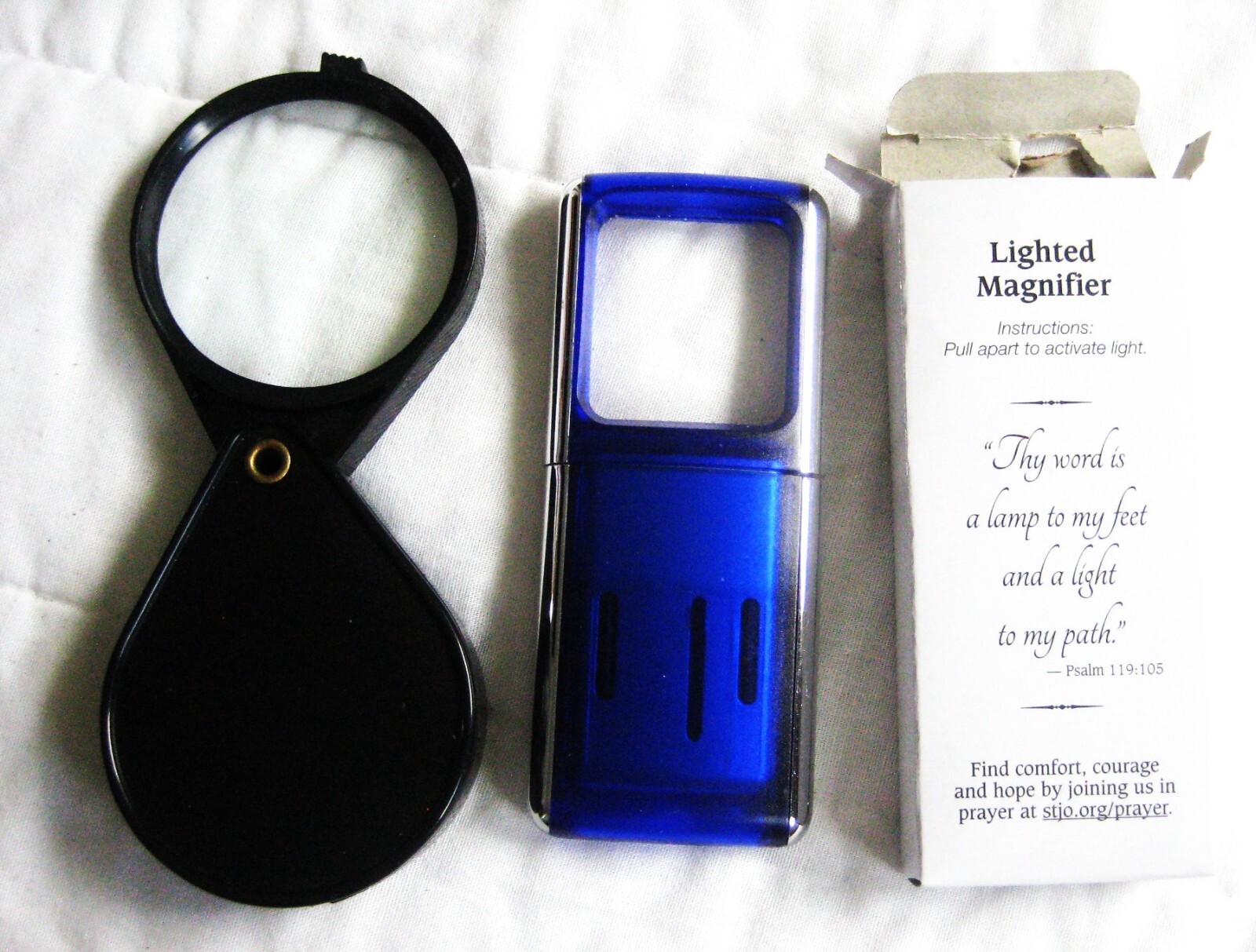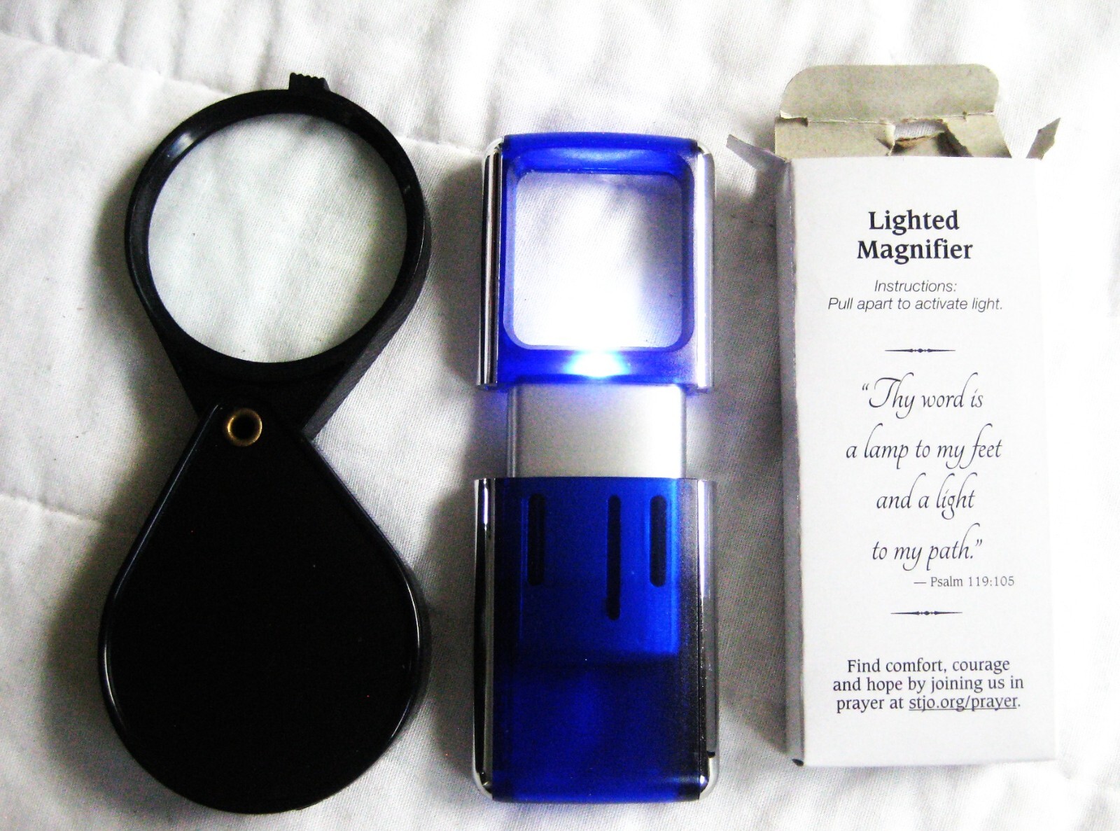 как выглядит 2 Pocket Magnifiers new 1 folding 2.5" X 3" 1 Lighted in open box 4.5" X 2" фото