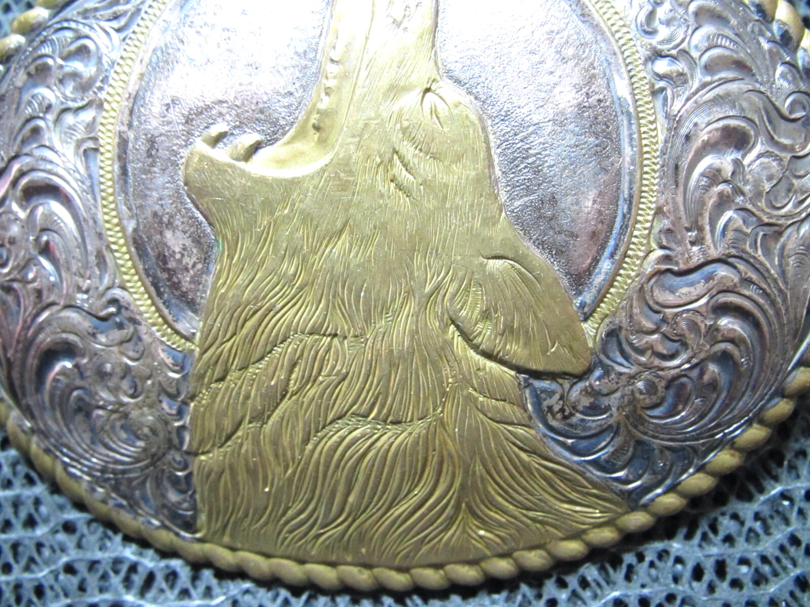 WESTERN HOWLING LONE WOLF COWBOY COWGIRL BELT BUCKLE VINTAGE CRUMRINE USA