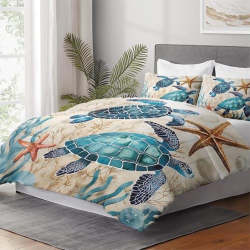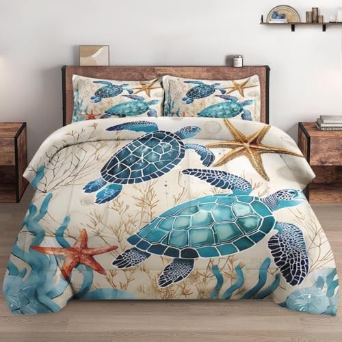 Comforter Set Size with 2 Pillowcases, Ocean Coral Sea Full Vintage Turtle