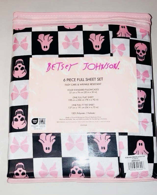 как выглядит Betsey Johnson 6 Piece Full Sheet Set, Bow Halloween Check Pink with Pillowcases фото