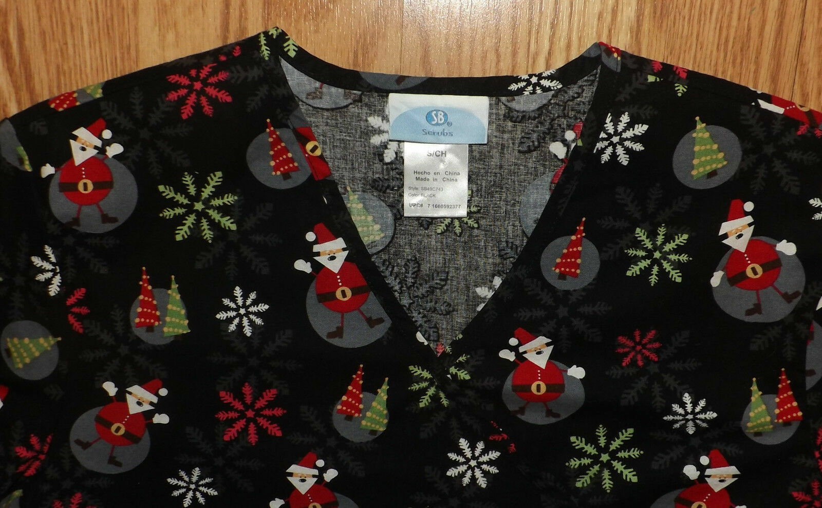 SB SCRUBS SANTA CLAUS HOLIDAY SCRUBS WOMENS SIZE SMALL NURSING MEDICAL BLOUSE