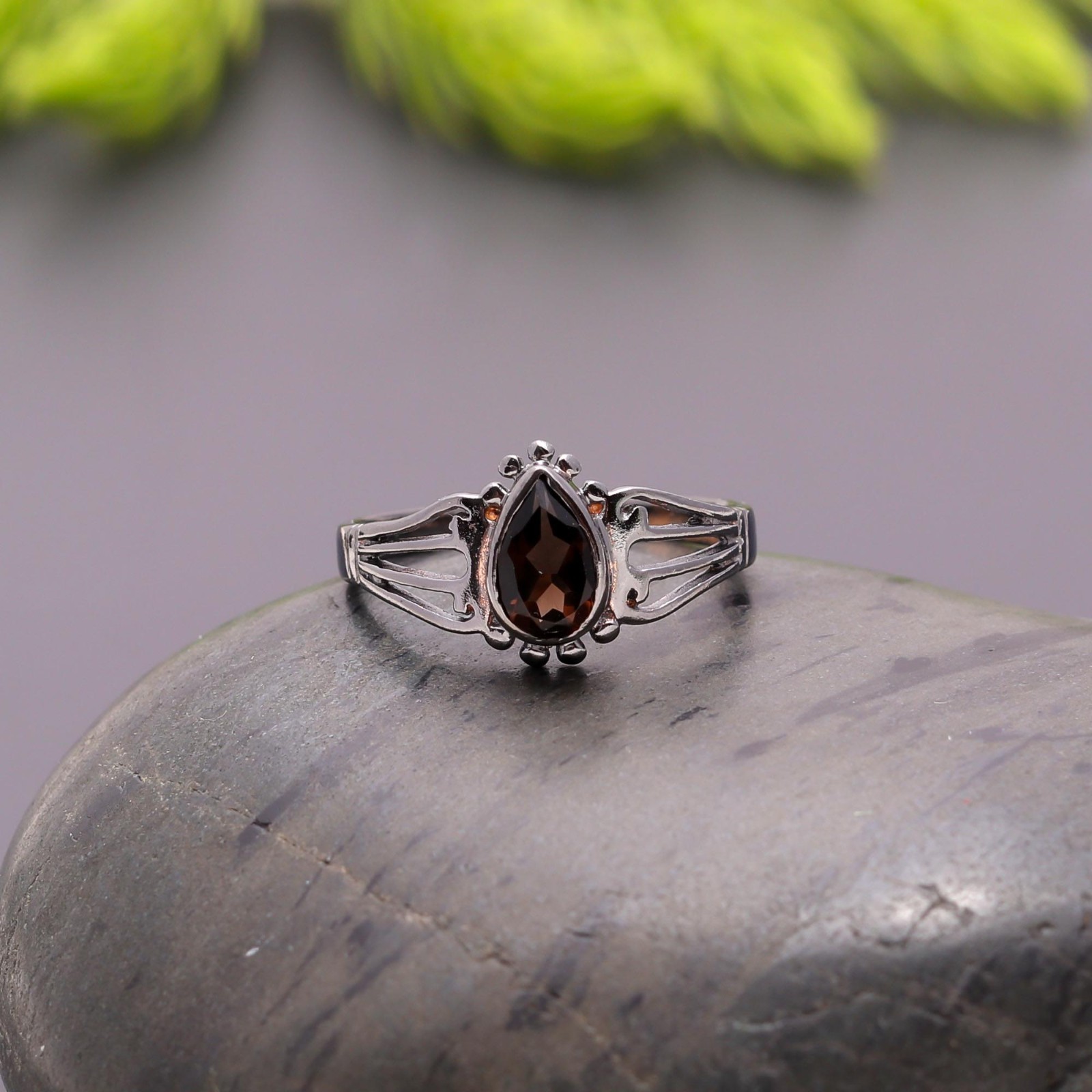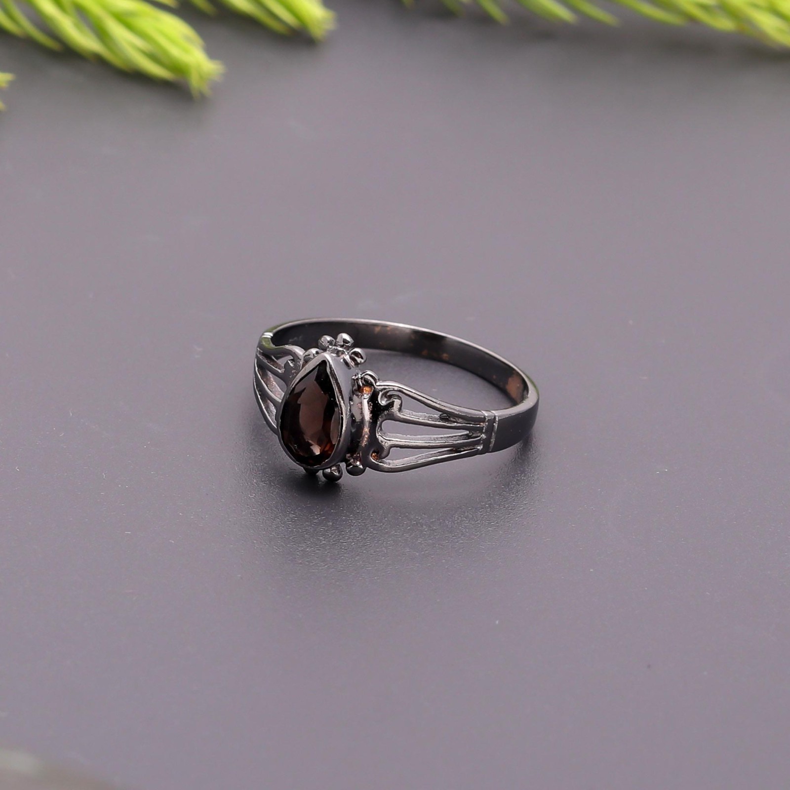 как выглядит Natural Smoky Quartz Pear Ring 925 Sterling Silver Oxidized Engagement Jewelry фото
