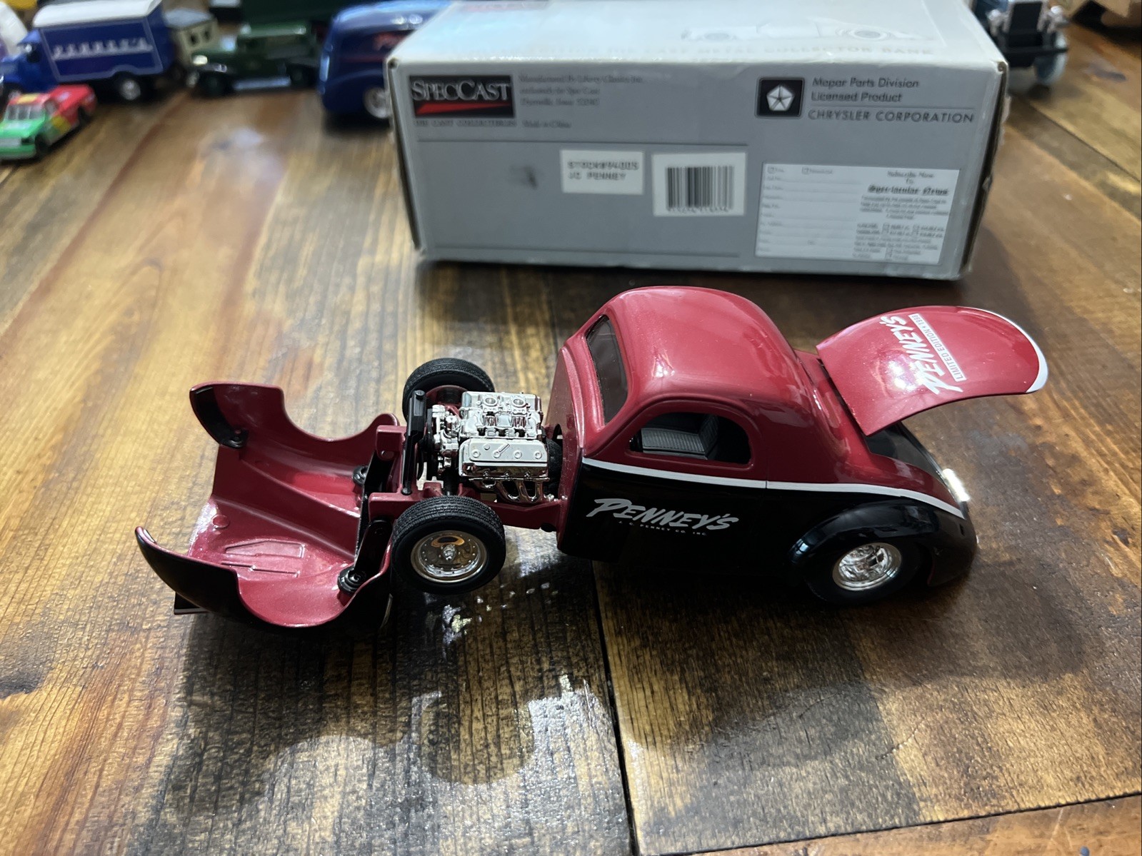 die-cast replica coin bank a 1941 Willys Coupe Street Rod PENNEY'S branding.