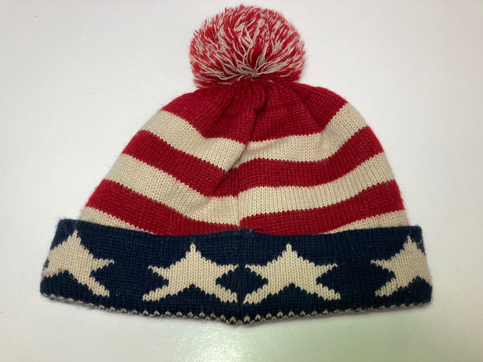 как выглядит Beanie Hat Patriotic Blue Beige Stars Red Stripes USA Flag Theme Pom фото