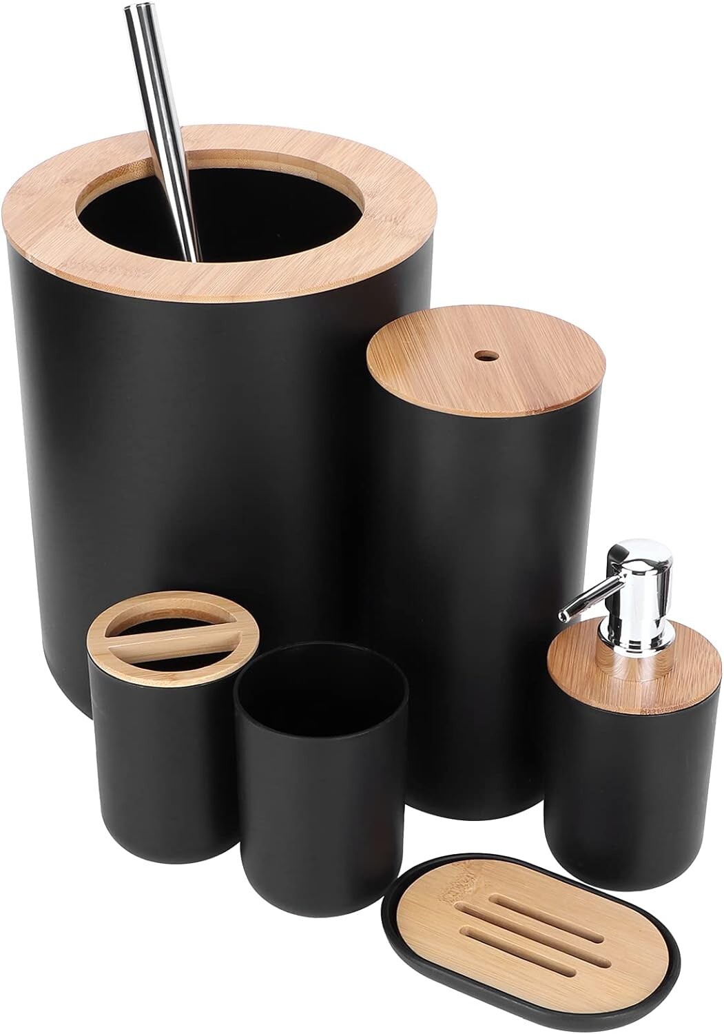 Bathroom Accessories Set 6pcs Bamboo Bath Soap Dispenser Toothbrush Holder Bin