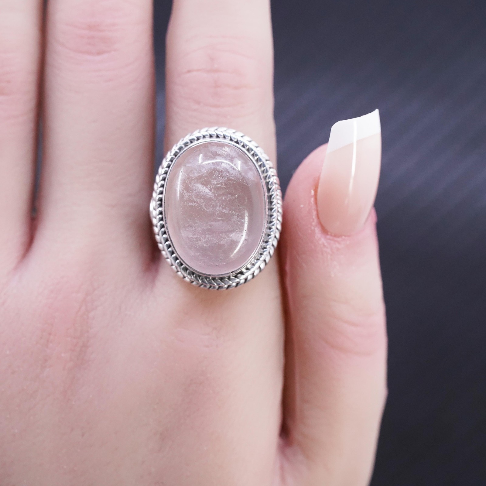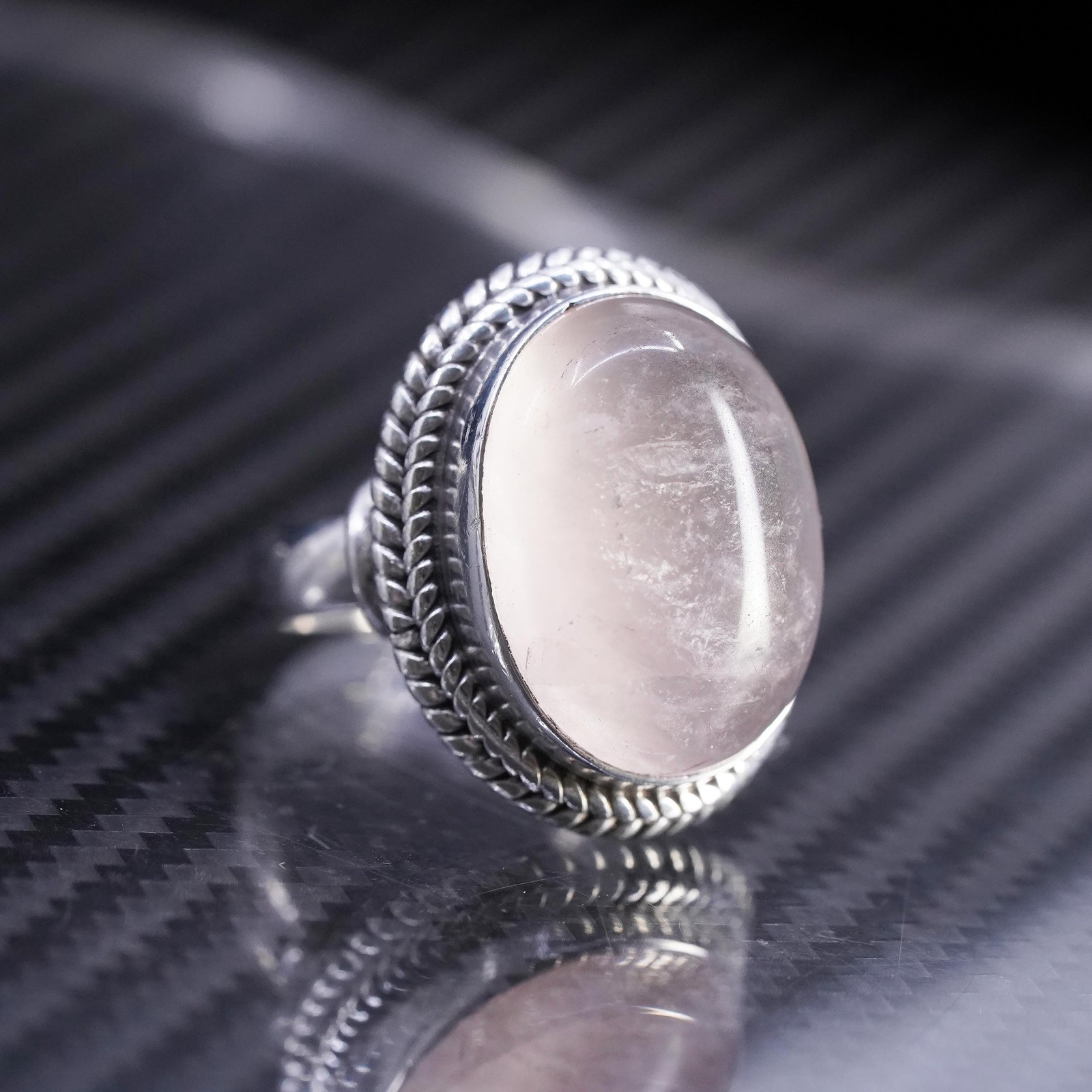 Size 8.25, vintage sterling silver 925 statement oval ring pink rose quartz