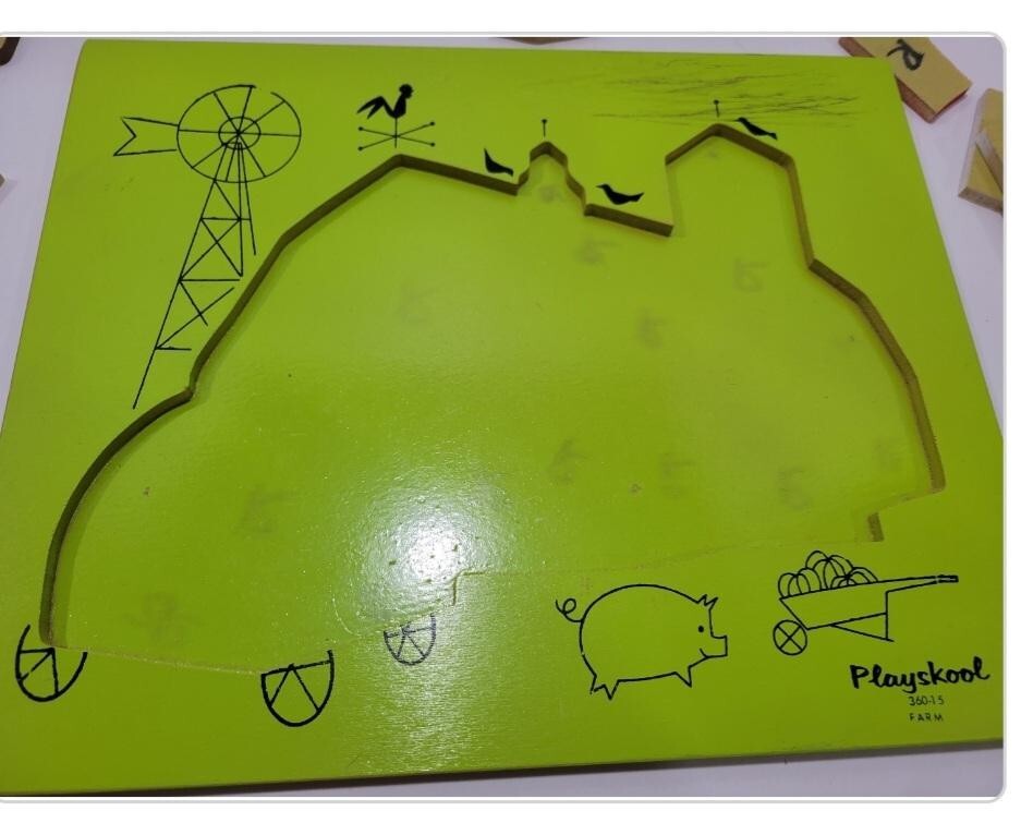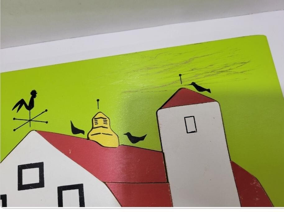 как выглядит Vintage Playskool Wooden Tray Puzzle Farm Barn Hay Wagon Pig 3-6yr 15pc фото