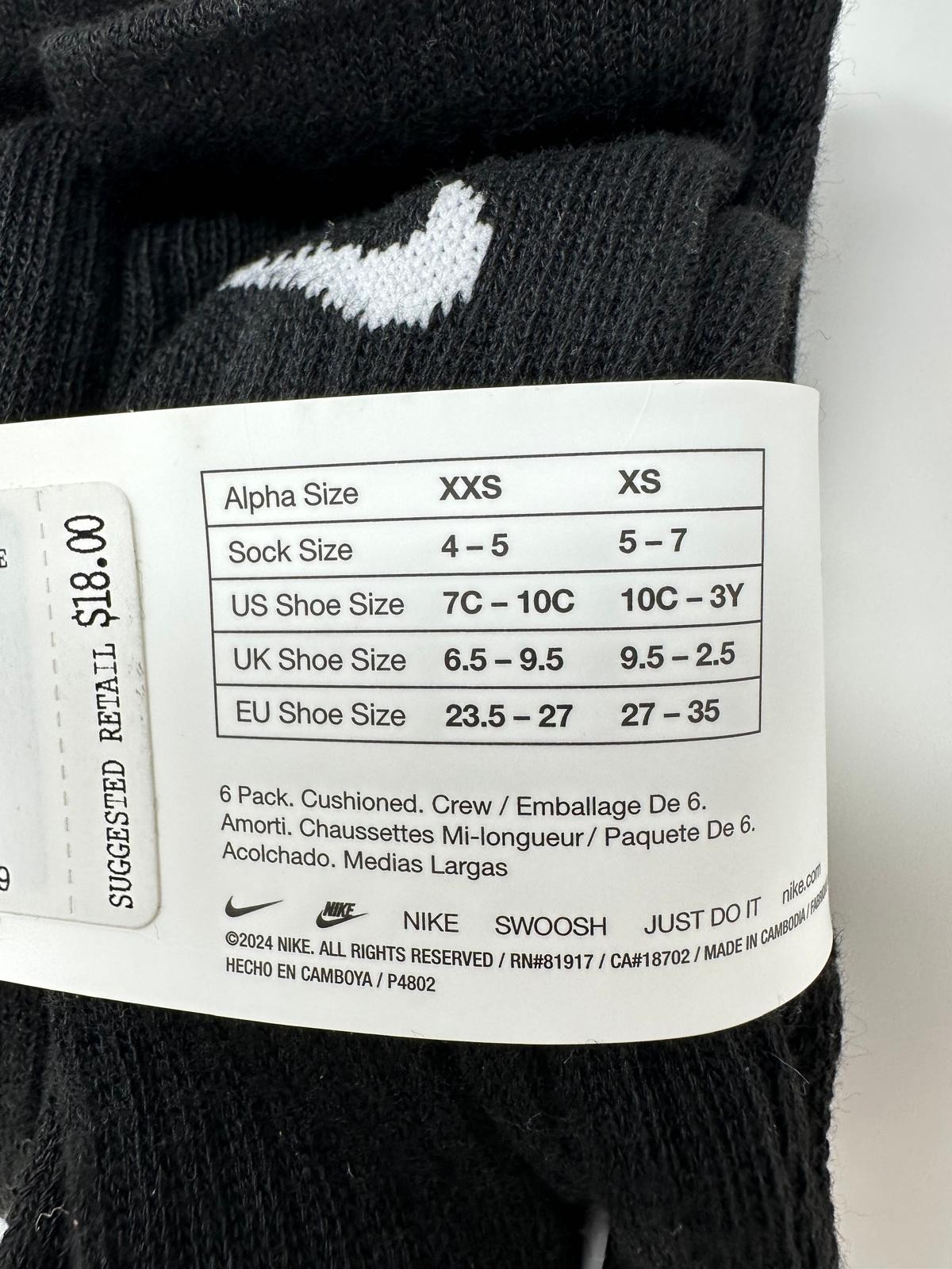 Nike Kid's 6-Pairs Cushioned Crew Socks 6979 , Size: 4-5, Black, E2 B939T