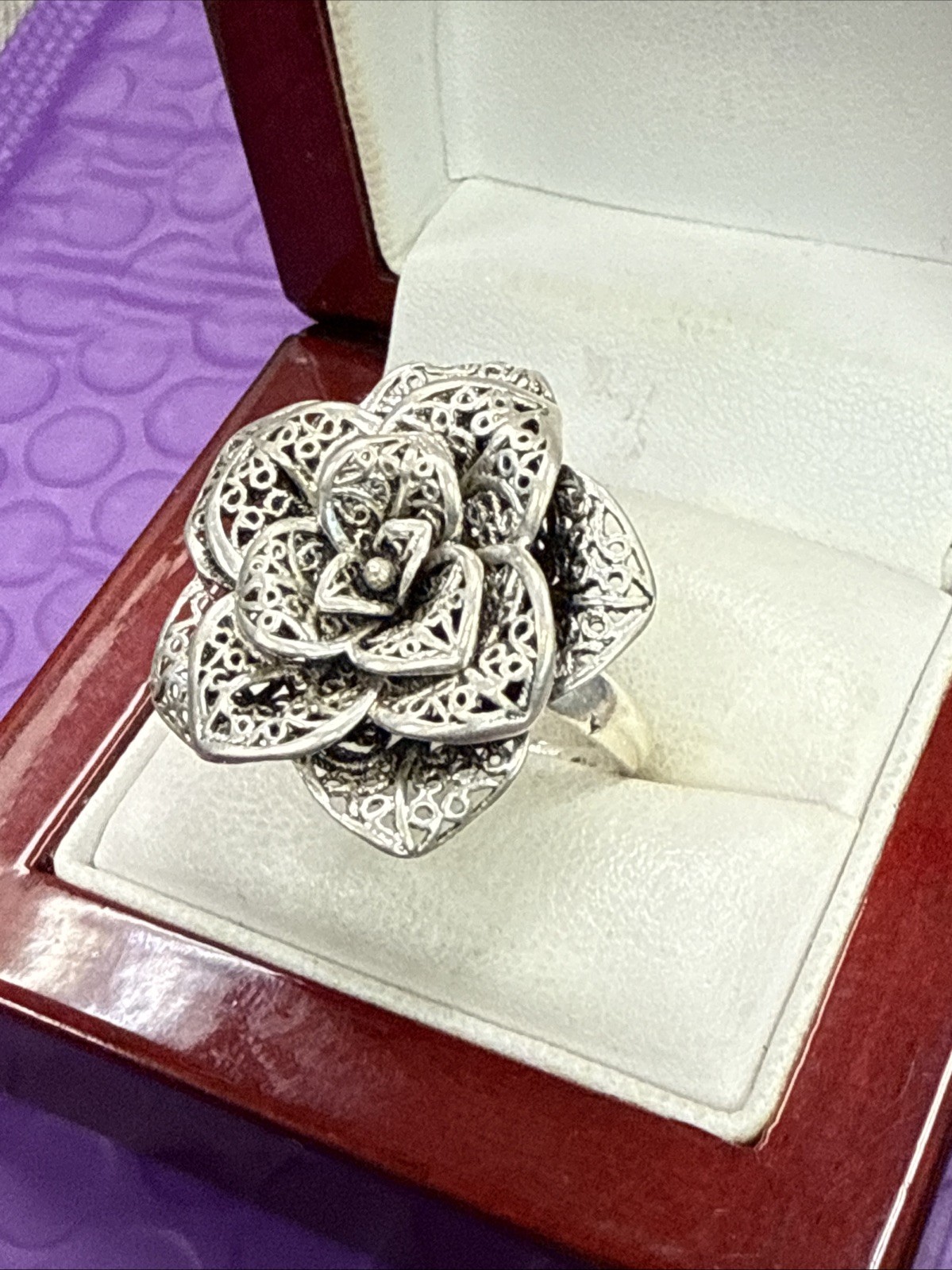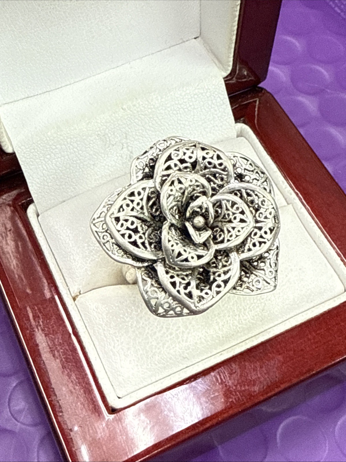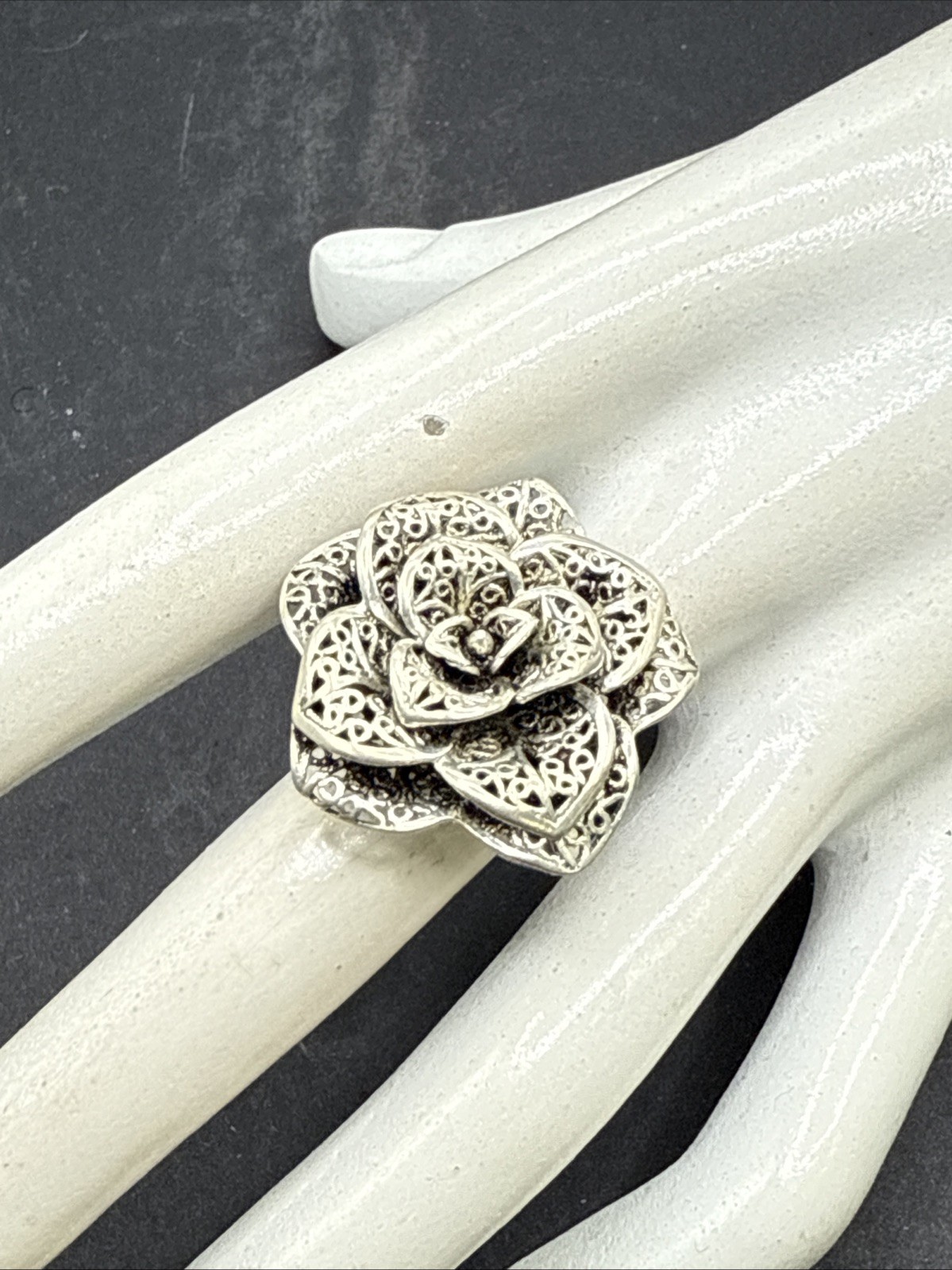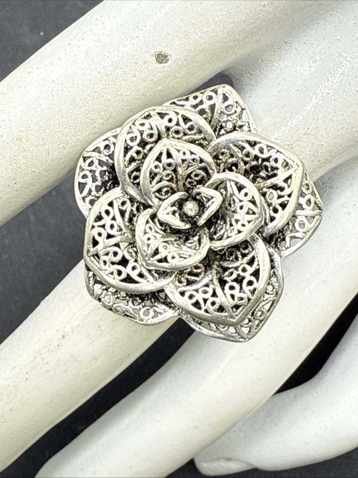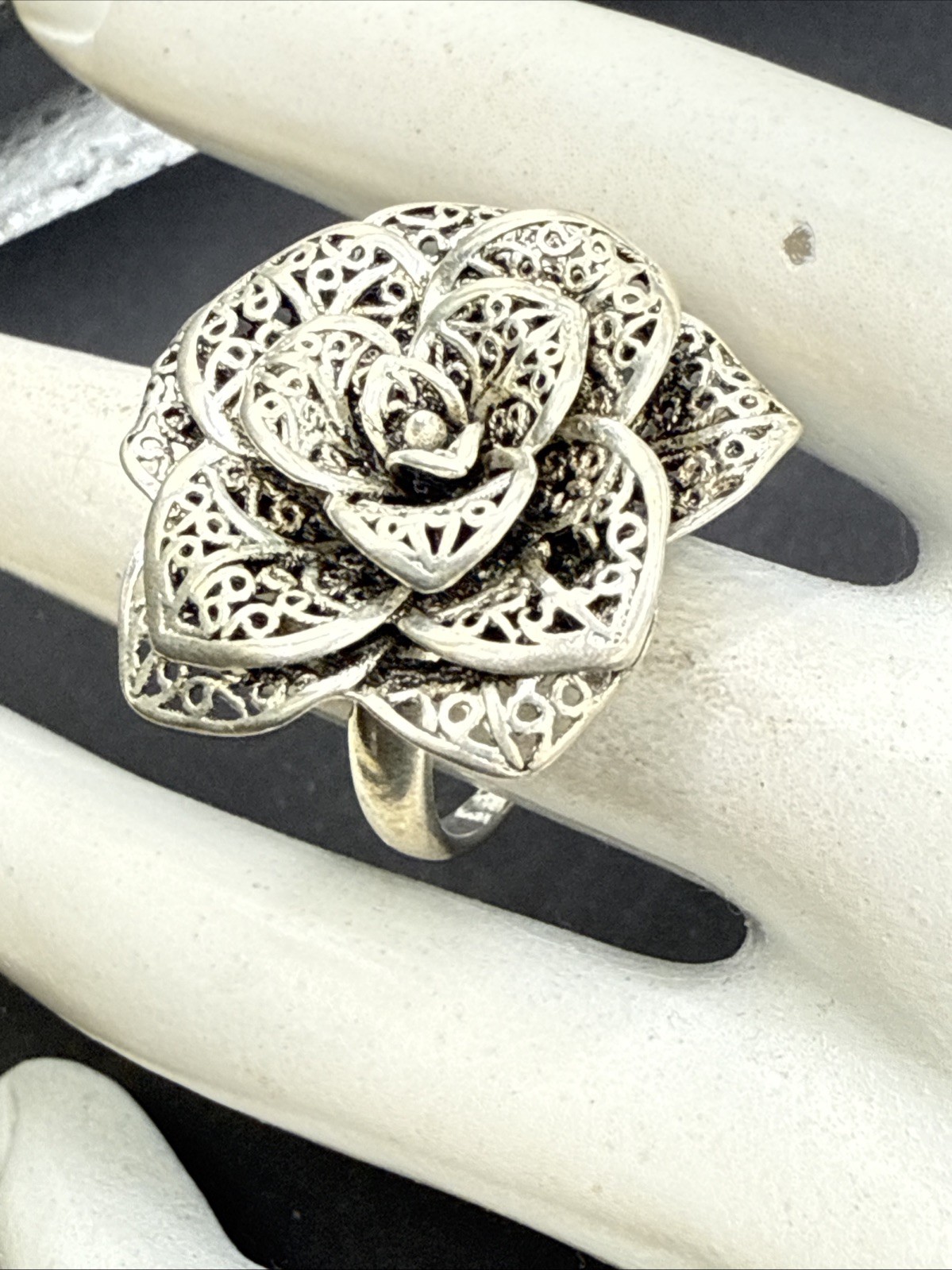 925 Silver Filigree Flower Layered Petals Statement Ring Sz 8 2