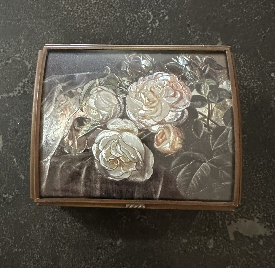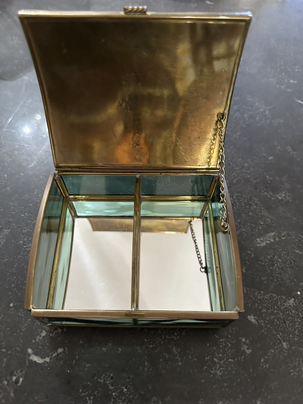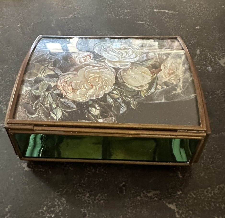 • Vintage Brass Glass Hinged Mirror Trinket Jewelry Box Pearl Roses Green Glass