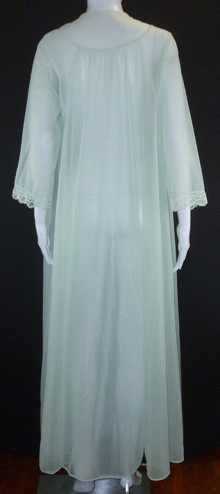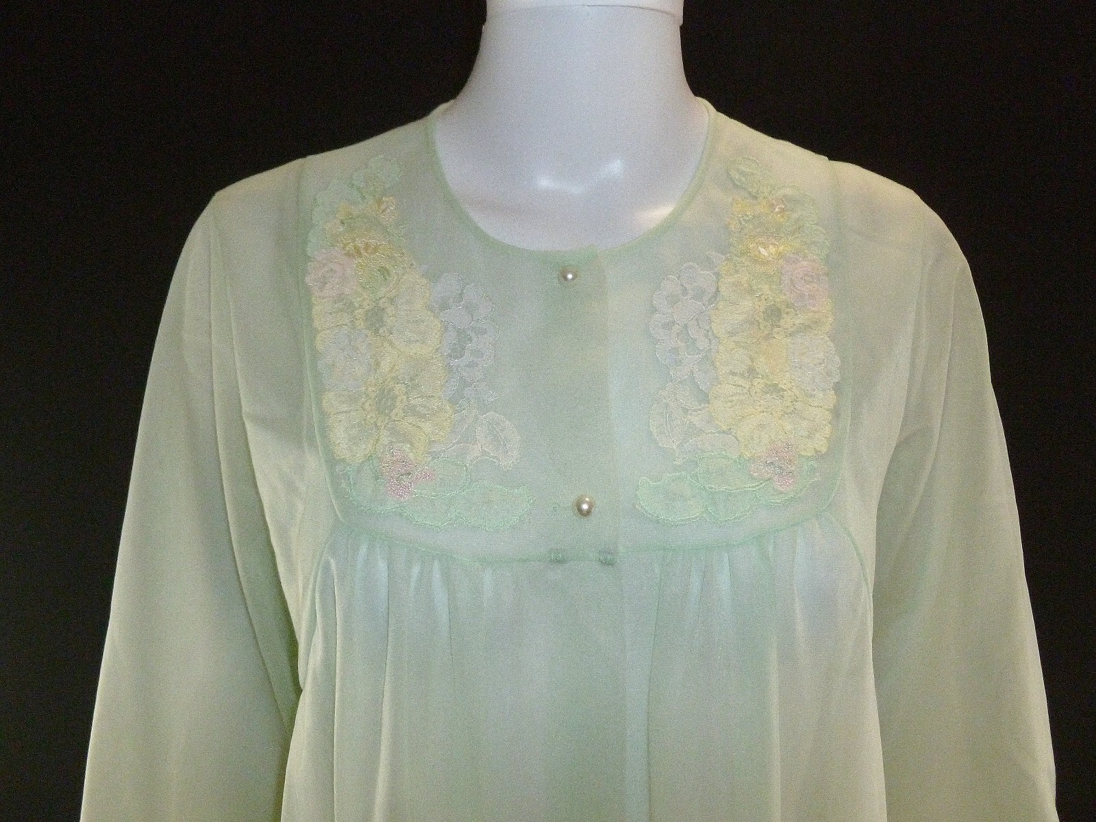 Vtg 60s Shadowline Nylon Chiffon Light Green Robe Pastel Floral Lace Gown Small