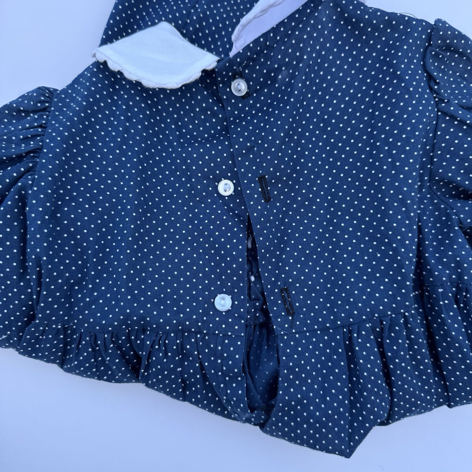 как выглядит Vintage Polly Flinders Hand Smocked Girls Dress Navy Blue White Dot Bows 4T фото