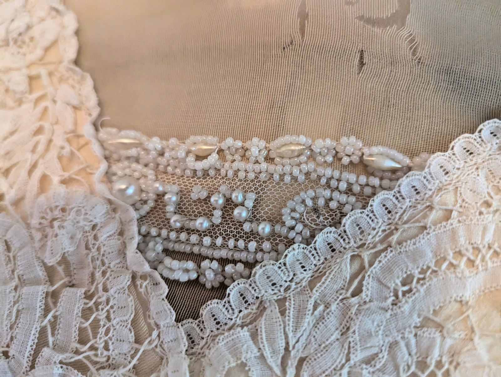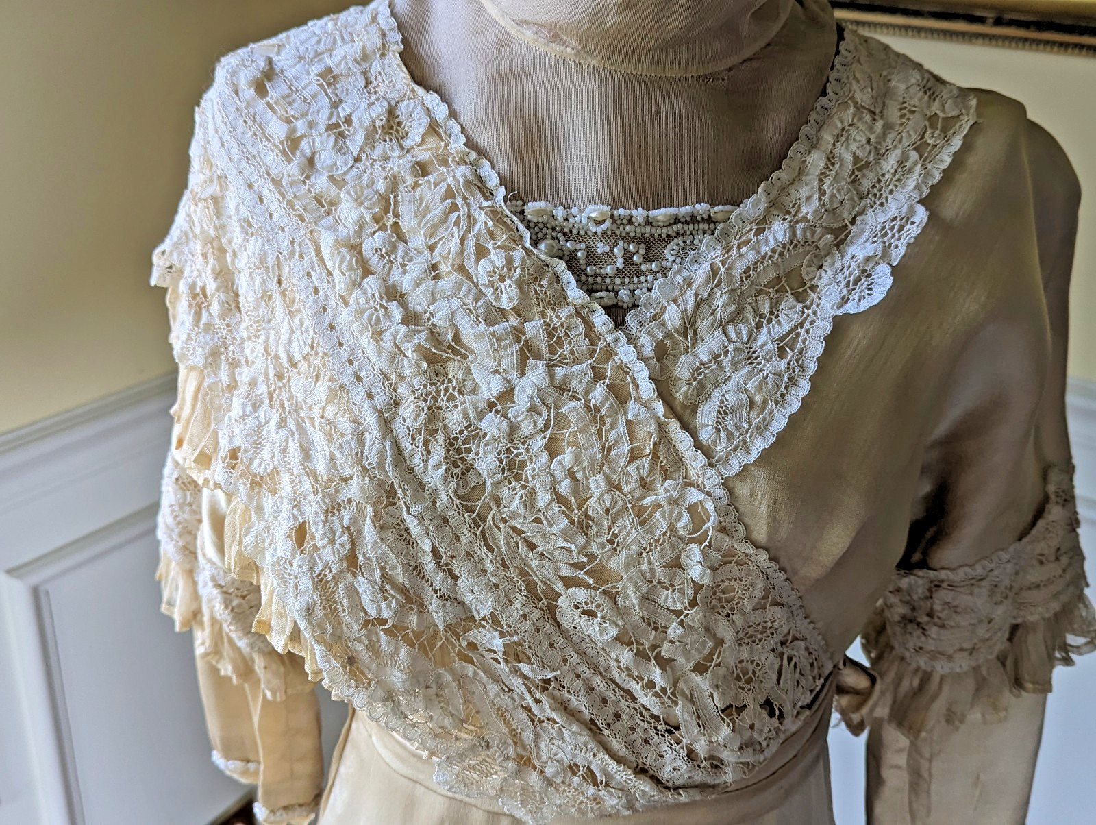 Antique 1900's Edwardian Bridal Evening Dress Bobbin Tape Lace Beads Faux Pearls