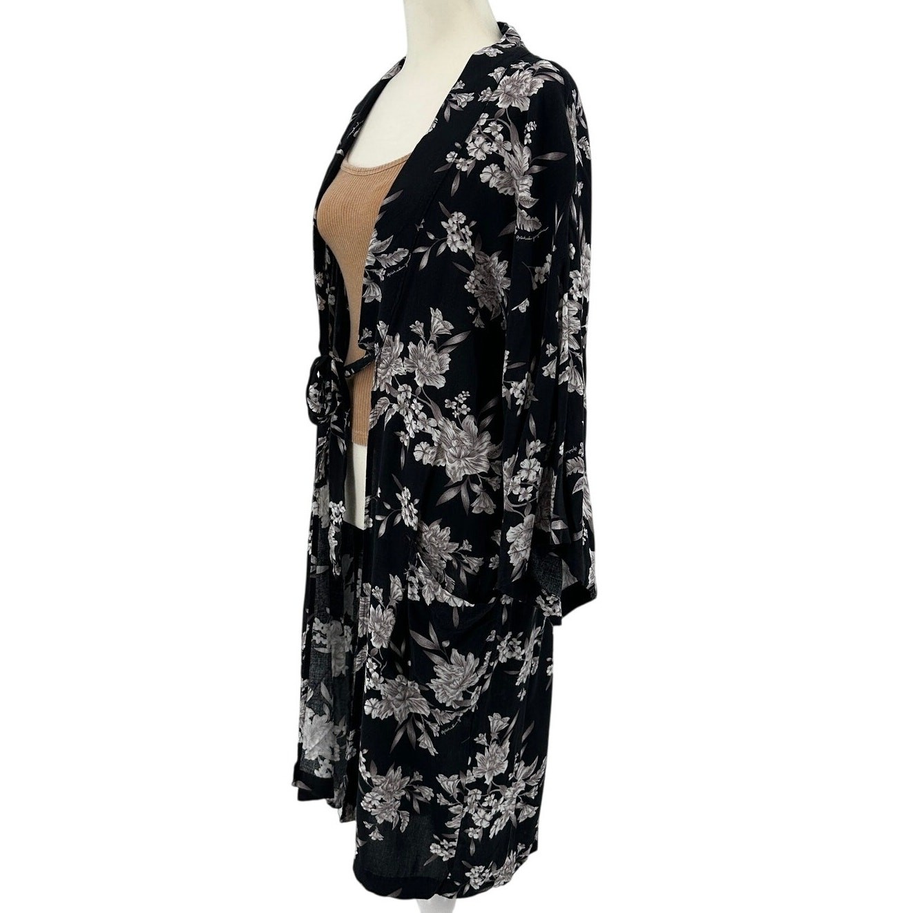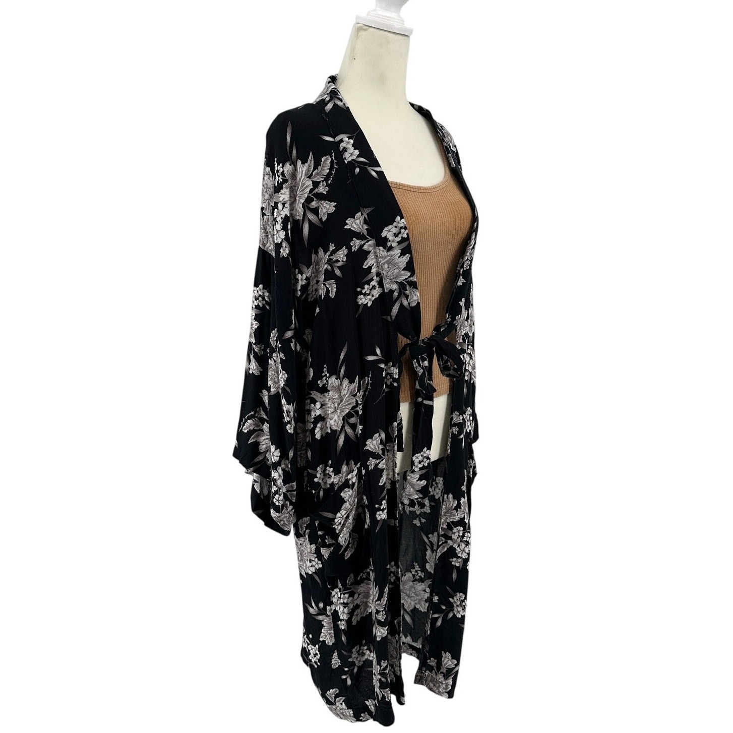 Spiritual Gangster Maya Kimono Cover Up Robe SZ OS Tie Front Black White Floral