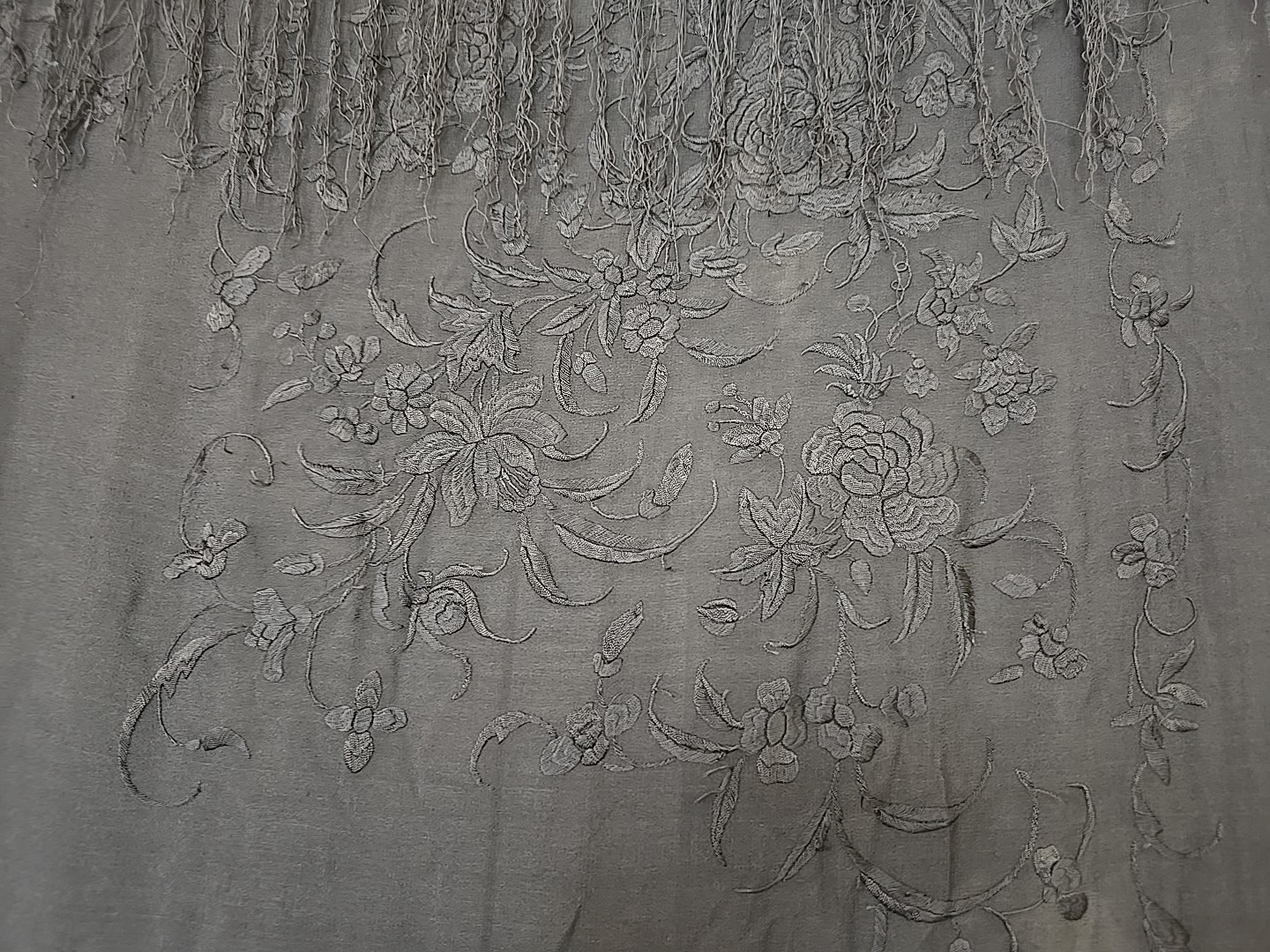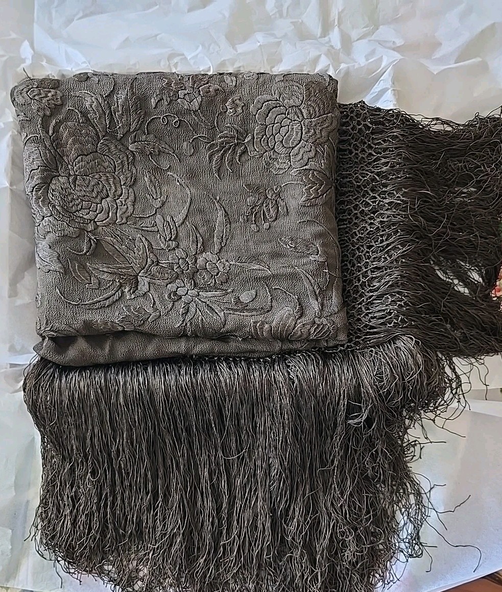 Antique Vintage Brown Silk Embroidery Large Square Piano Shawl Wrap Fringe Tasse