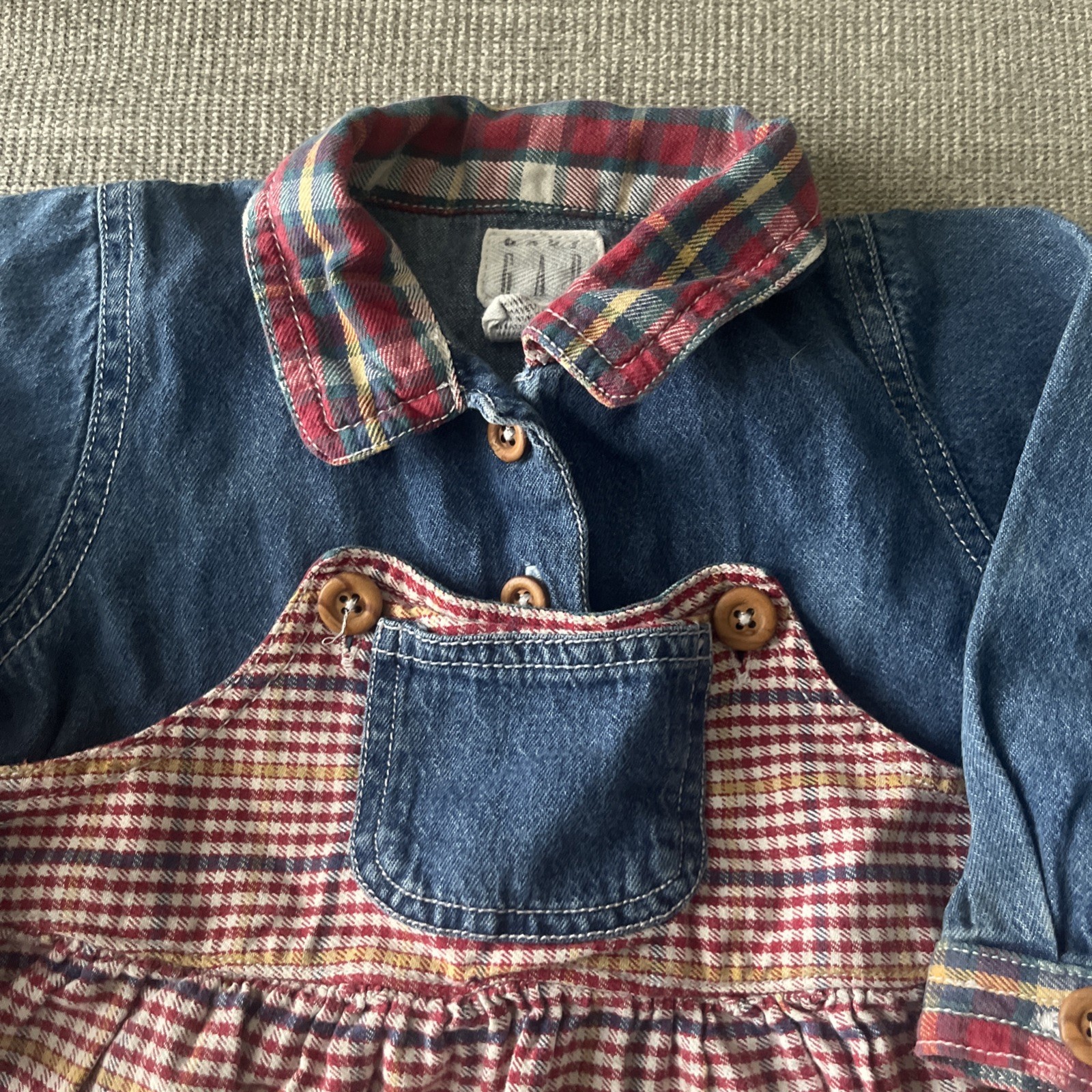 как выглядит Vintage 90 s Baby Gap Denim/ Plaid Dress Size 12-18 Mo. Wood Buttons Collar EUC фото