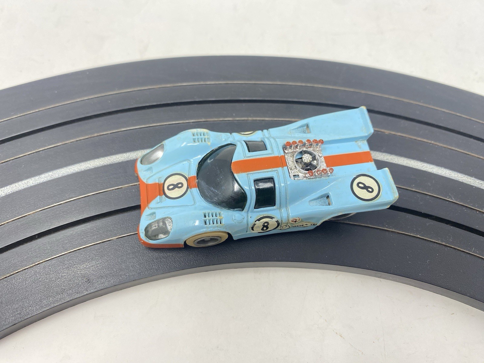 Vintage Tyco Gulf Porsche 917 Lt Blue/Orange Slot Car w/ Lights - Nice Runs