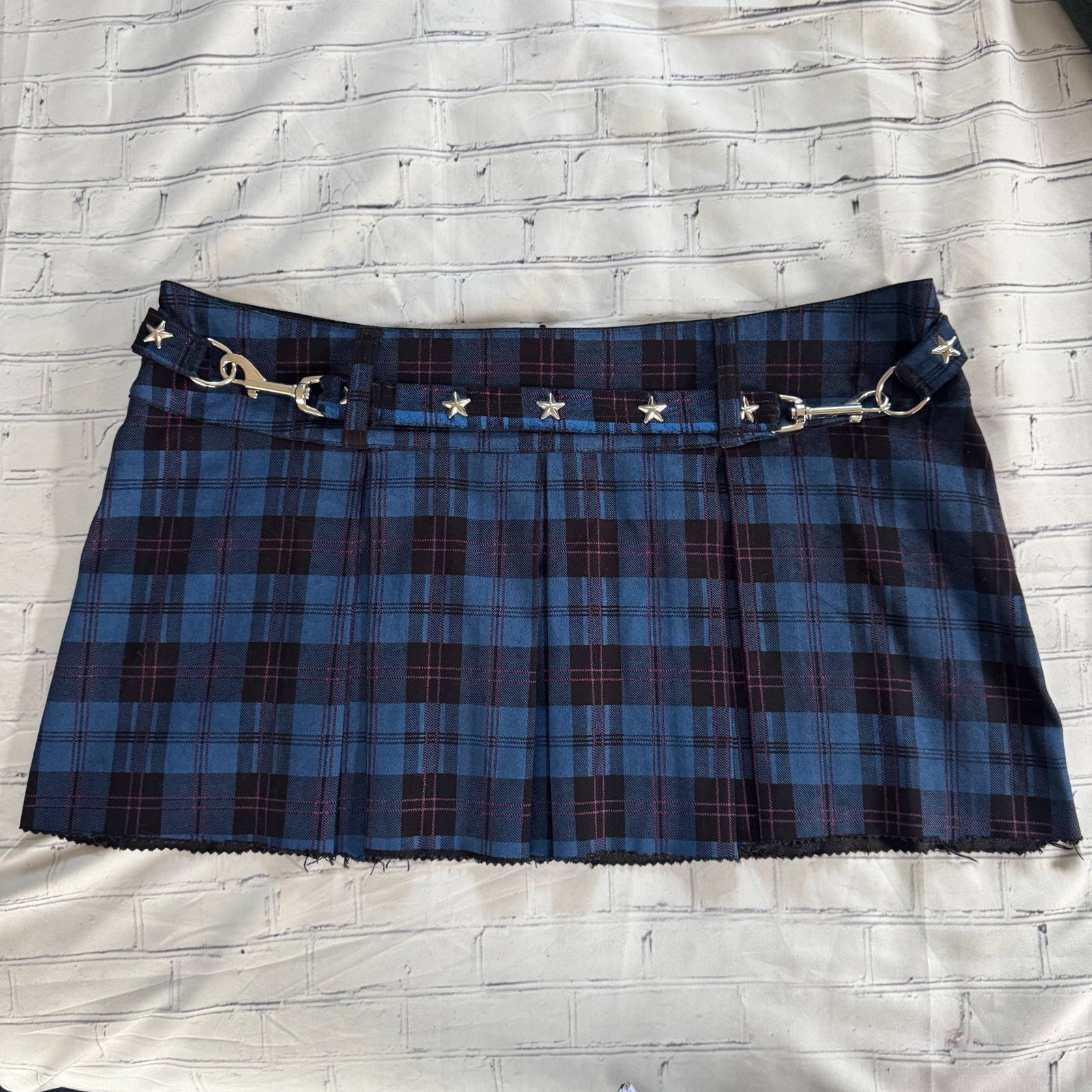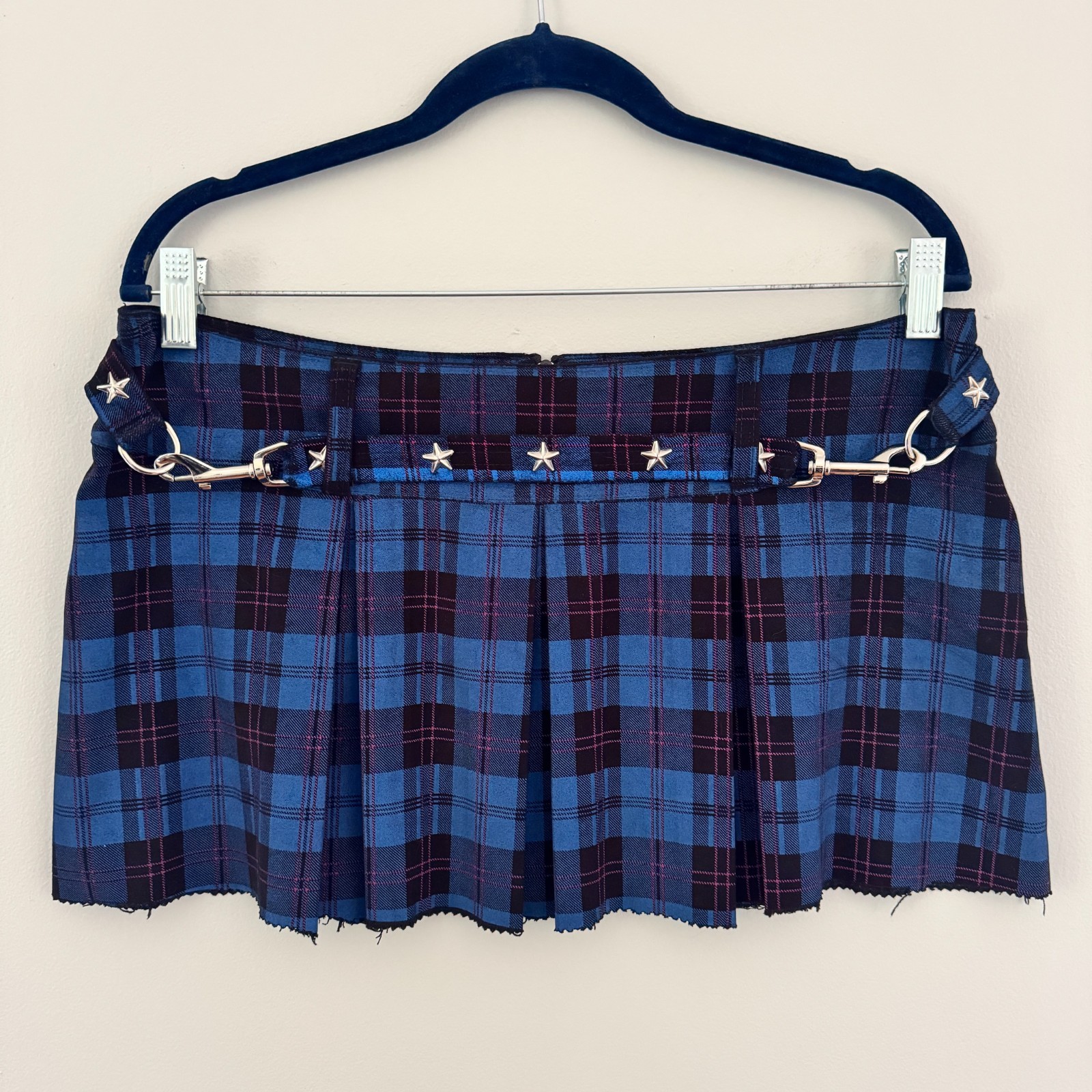 VTG Y2K Blue Plaid MT:2 Pleated STUDDED Mini Skirt HOT TOPIC Mall Punk Bondage L