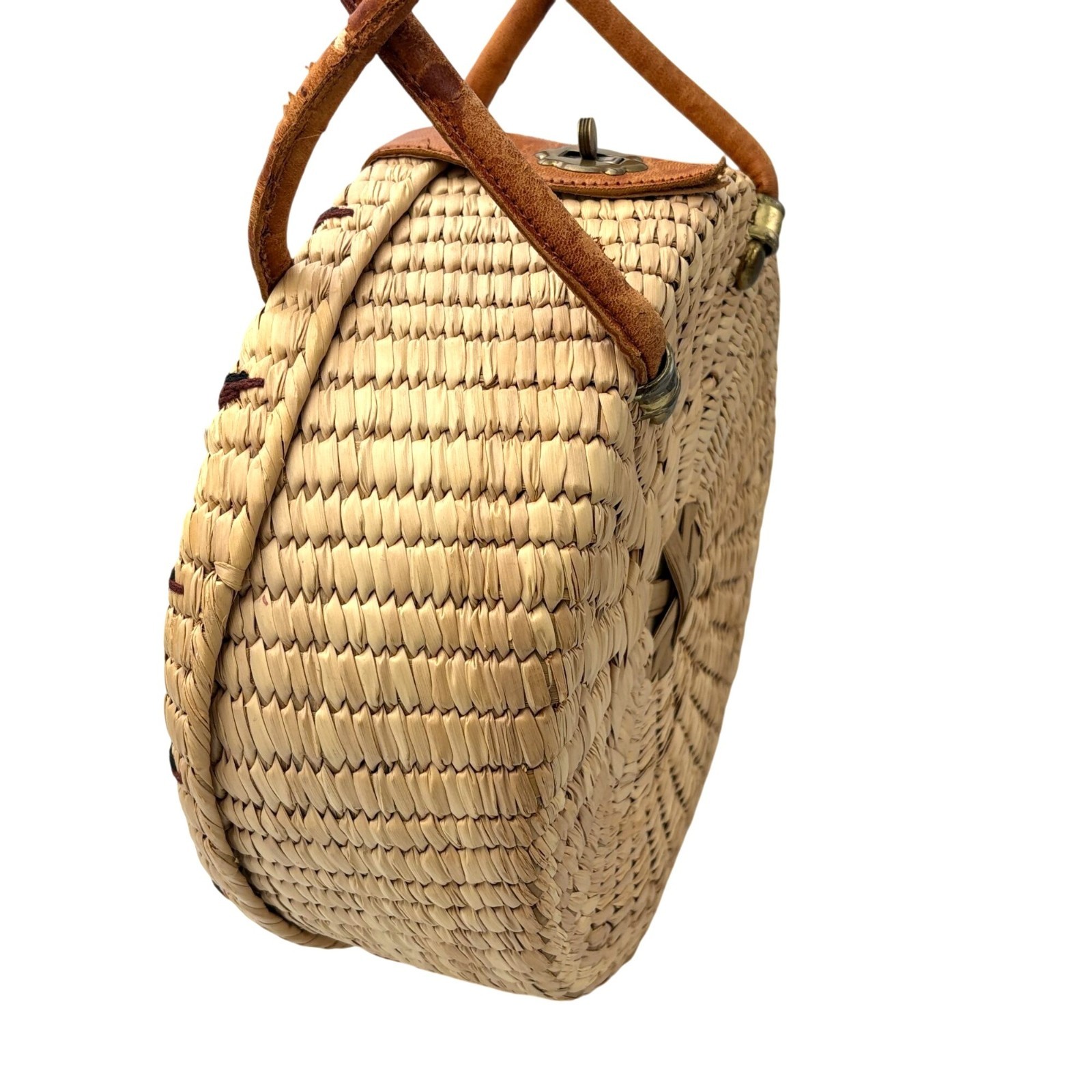 Vtg Statement Round Woven Straw Purse With Leather Handles Flower Detail SEE