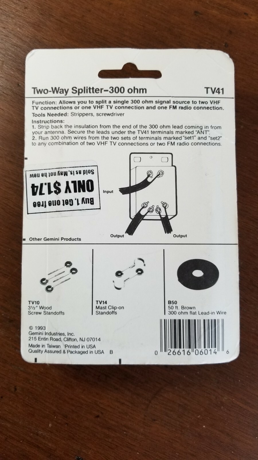 Vintage Gemini TV/FM 2 Set Coupler VHF - FM TV41 Antennas Accessories