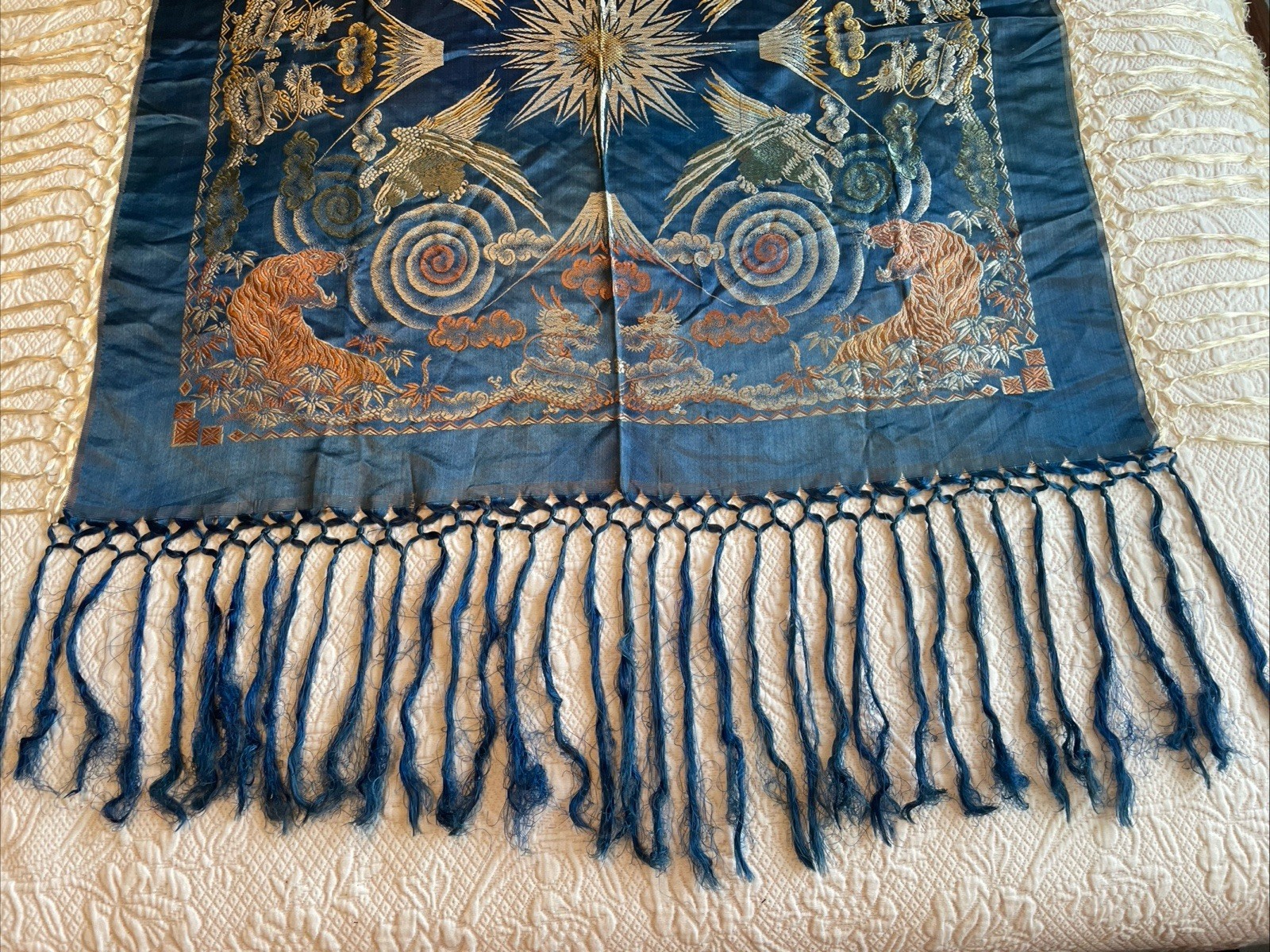 Vintage Taj Mahal Style Blue Brocade Piano Shawl Fringed Scarf Tiger Dragon Bird