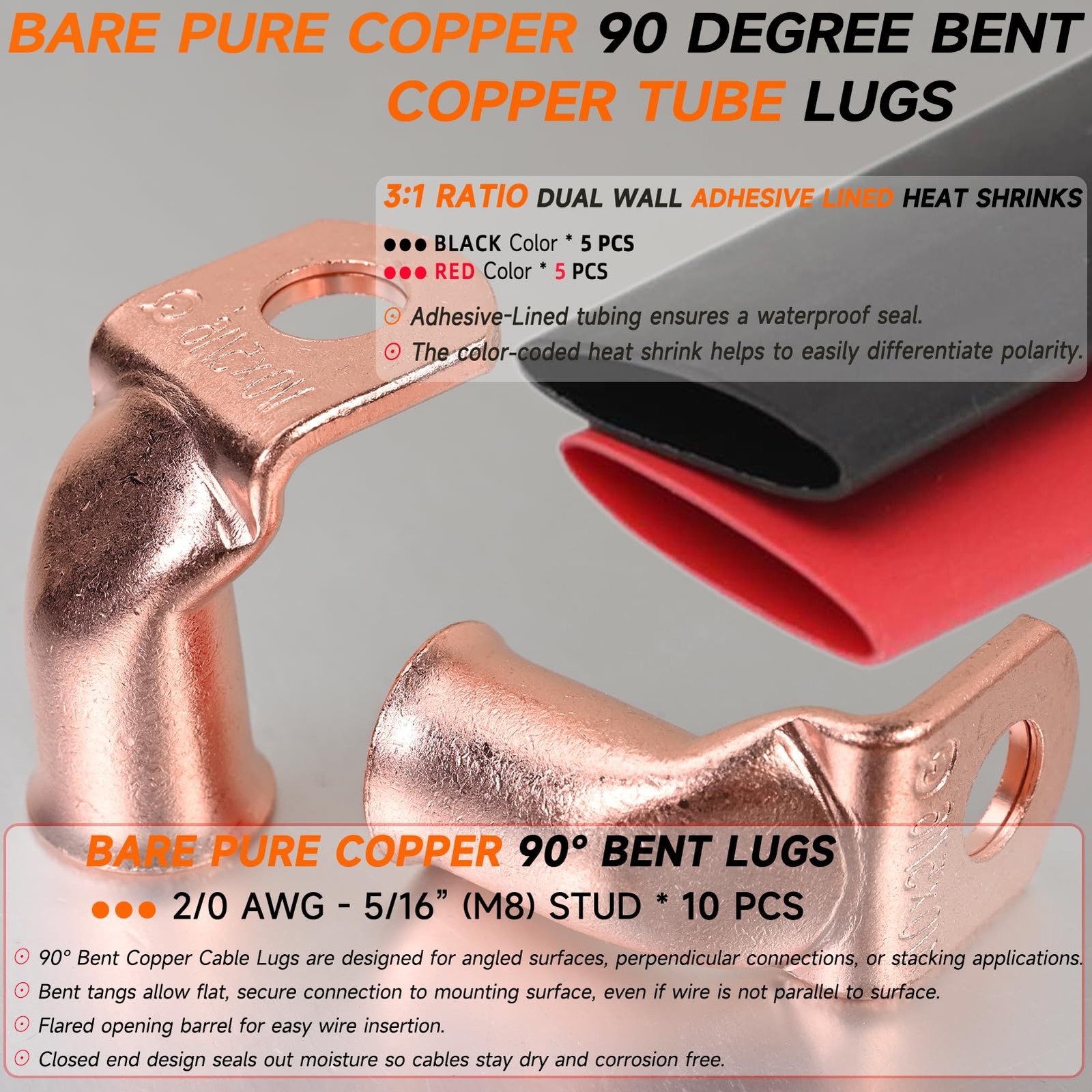 10 PCS 2/0 AWG-5/16 90-Degree Bent Battery Lugs with 10 PCS Heat Shrink