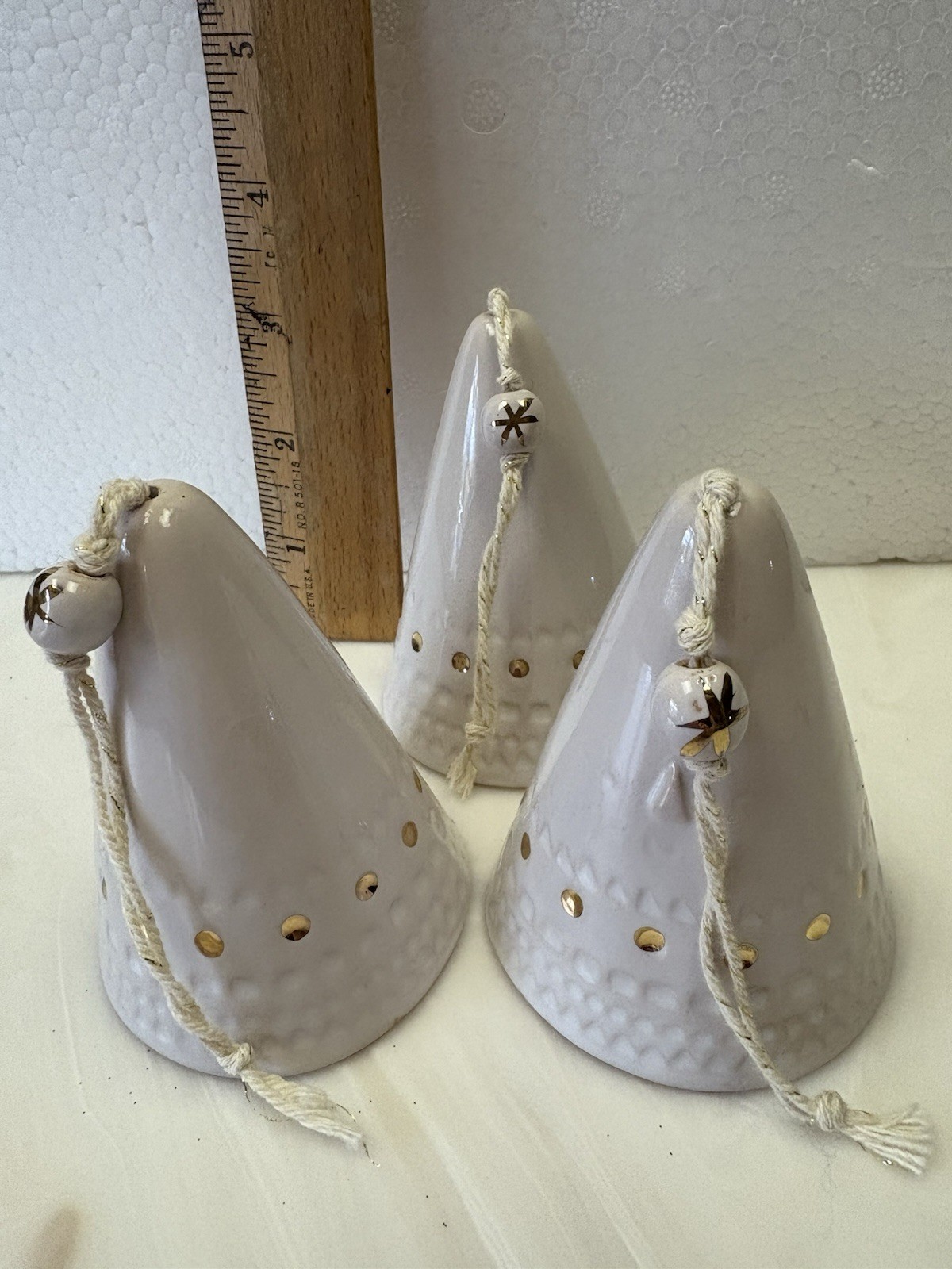 как выглядит Lot of 3 Anthropologie Atelier Stella Triangle Bells Face Folk Art white w/gold фото
