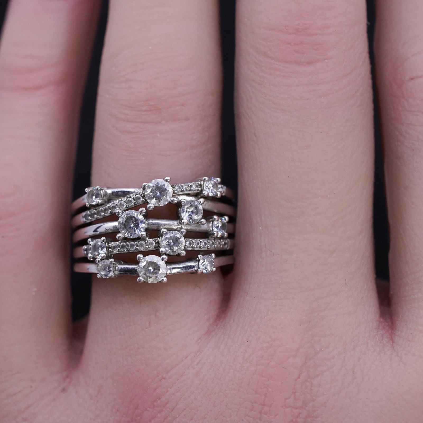 Size 7, vintage sterling silver 925 swirly band ring with cluster cz