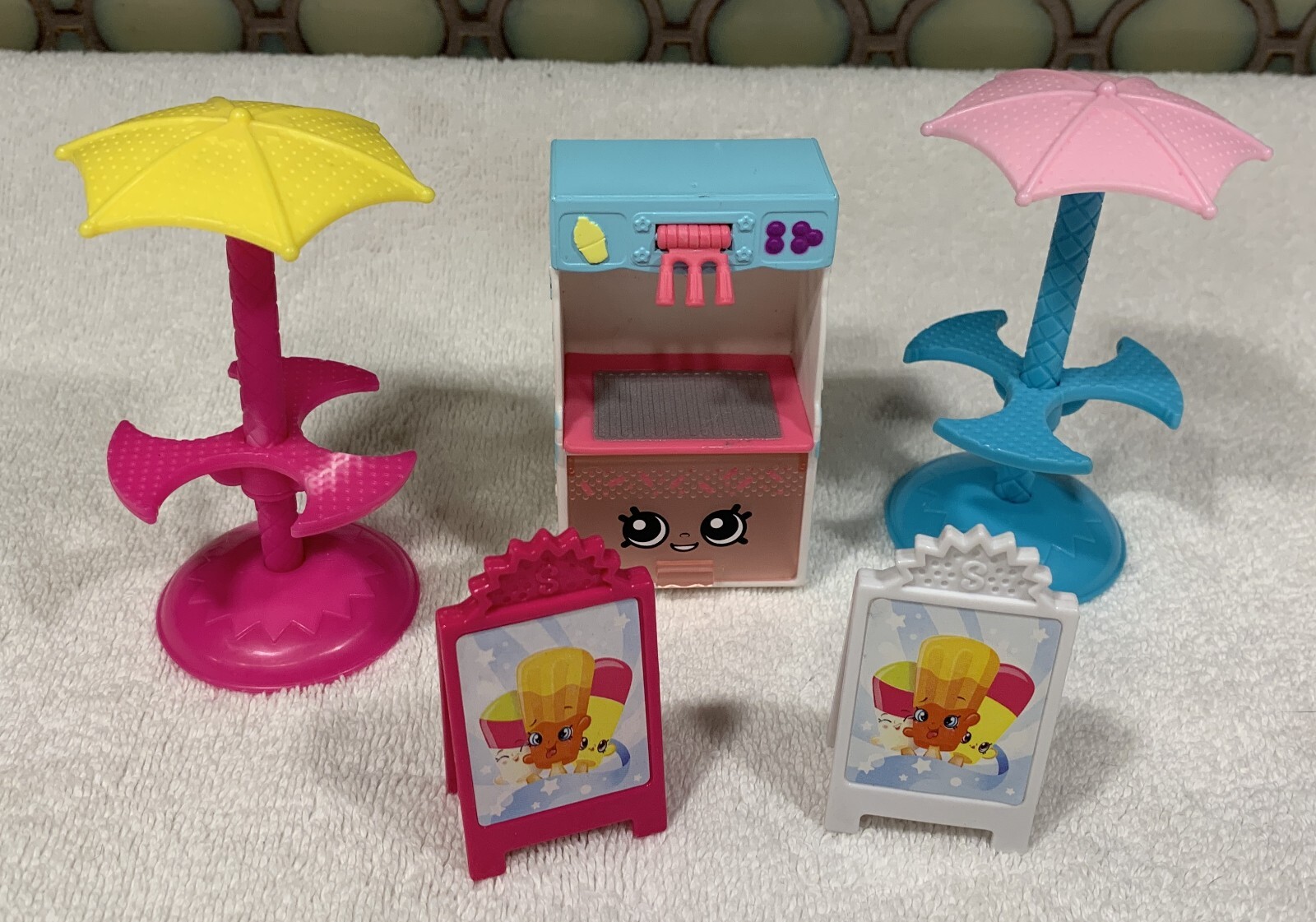 Shopkins Playset Lot: Glitzi Bus, Season 3 Bus, 2 Umbrellas, Ice Cream Machine