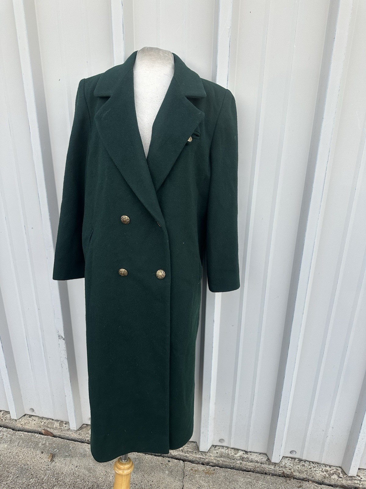 Vintage 80s Retro Green 100 Wool Double Breasted Gold Button Coat LP