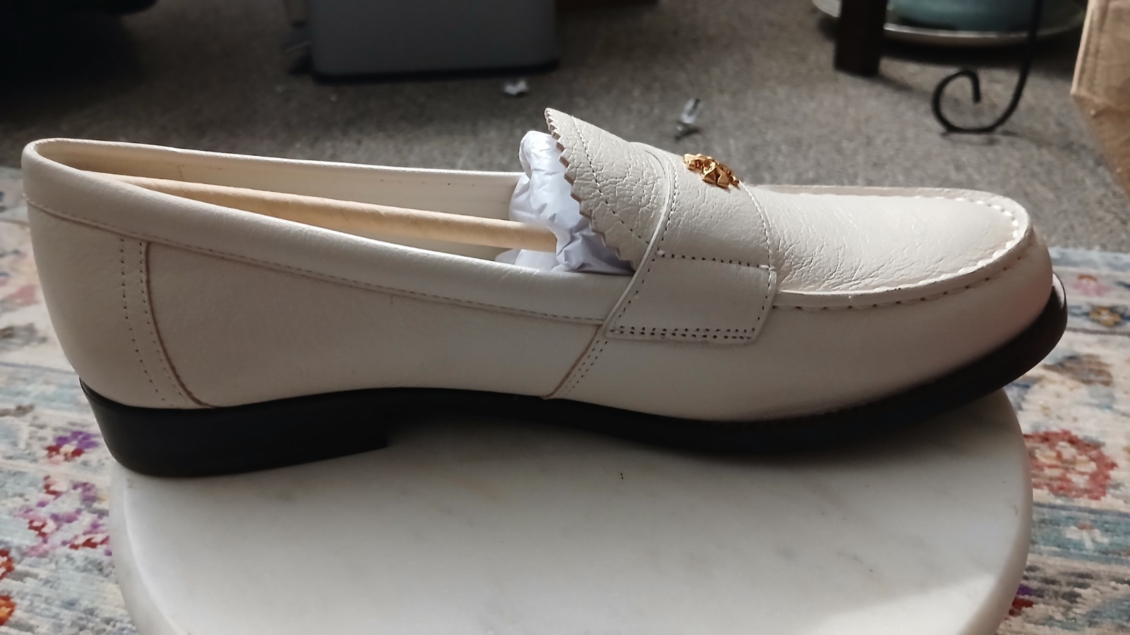 как выглядит New Tory Burch loafer, cream with signature gold medallion. фото