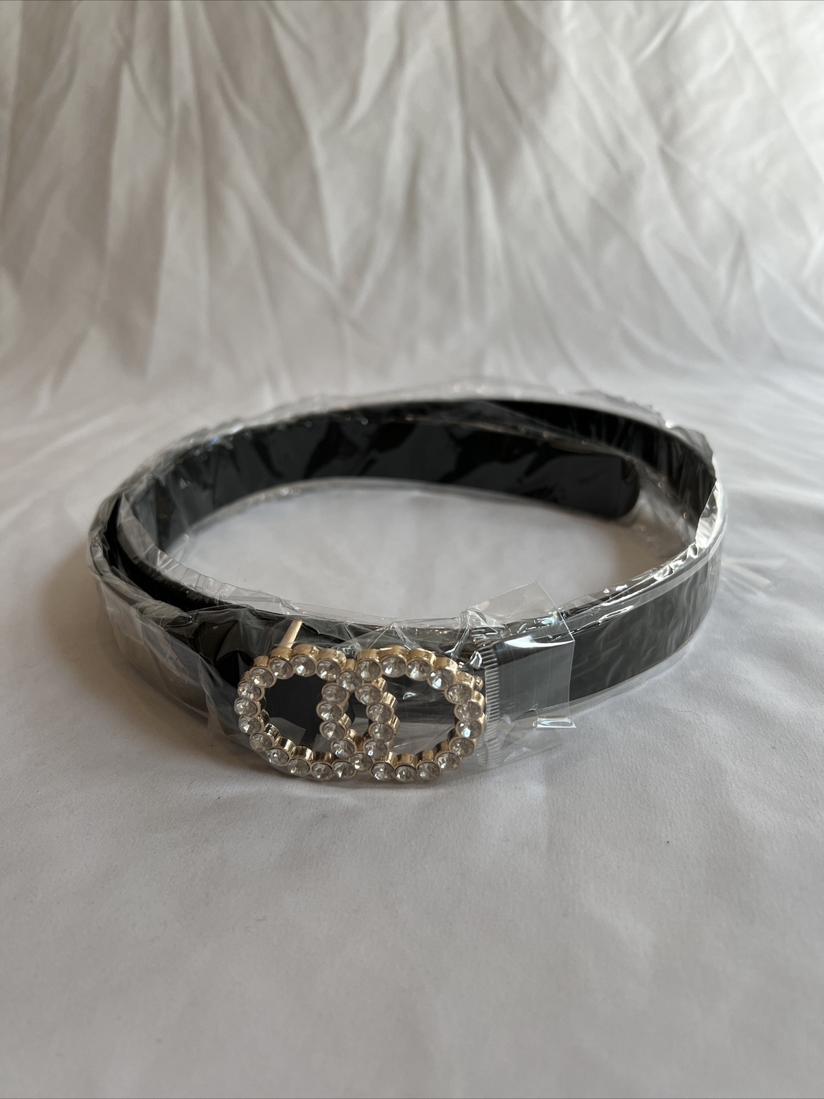 Faux Vegan Leather Black Double Circle Rhinestone Buckle Belt Black Slim XS/S