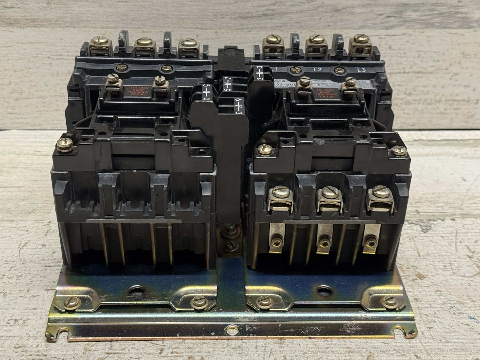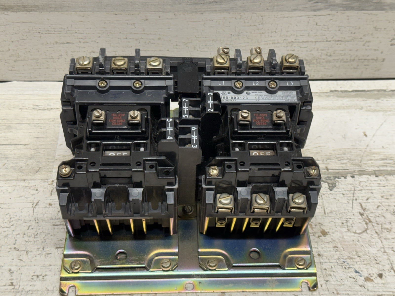 как выглядит ALLEN BRADLEY 505-B0D-23 SER C SIZE 1 10HP 27A REVERSING STARTER NICE фото