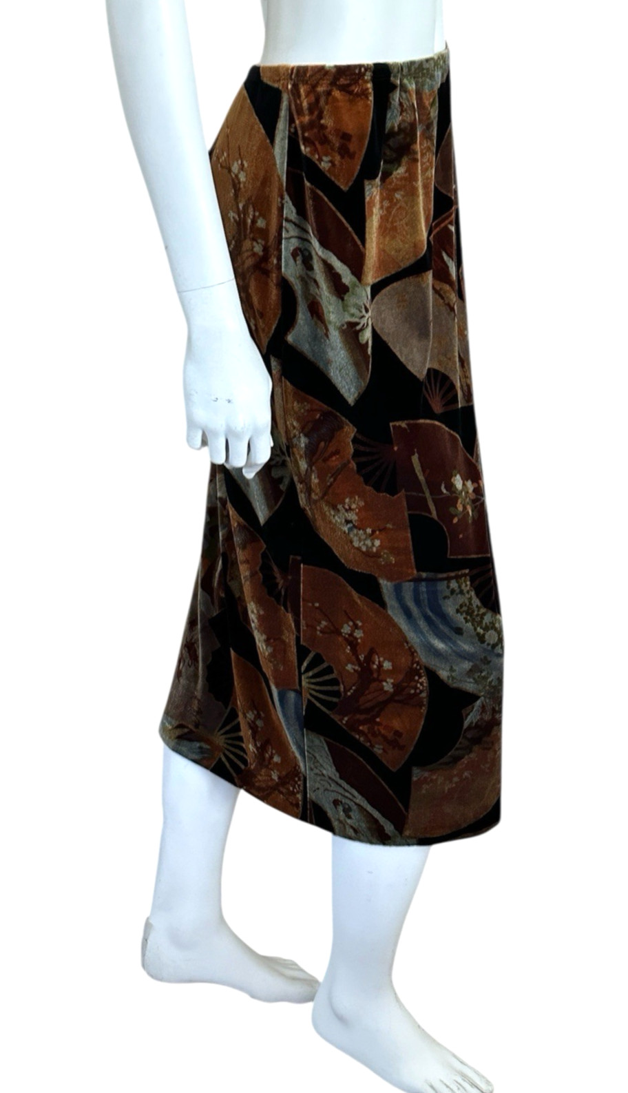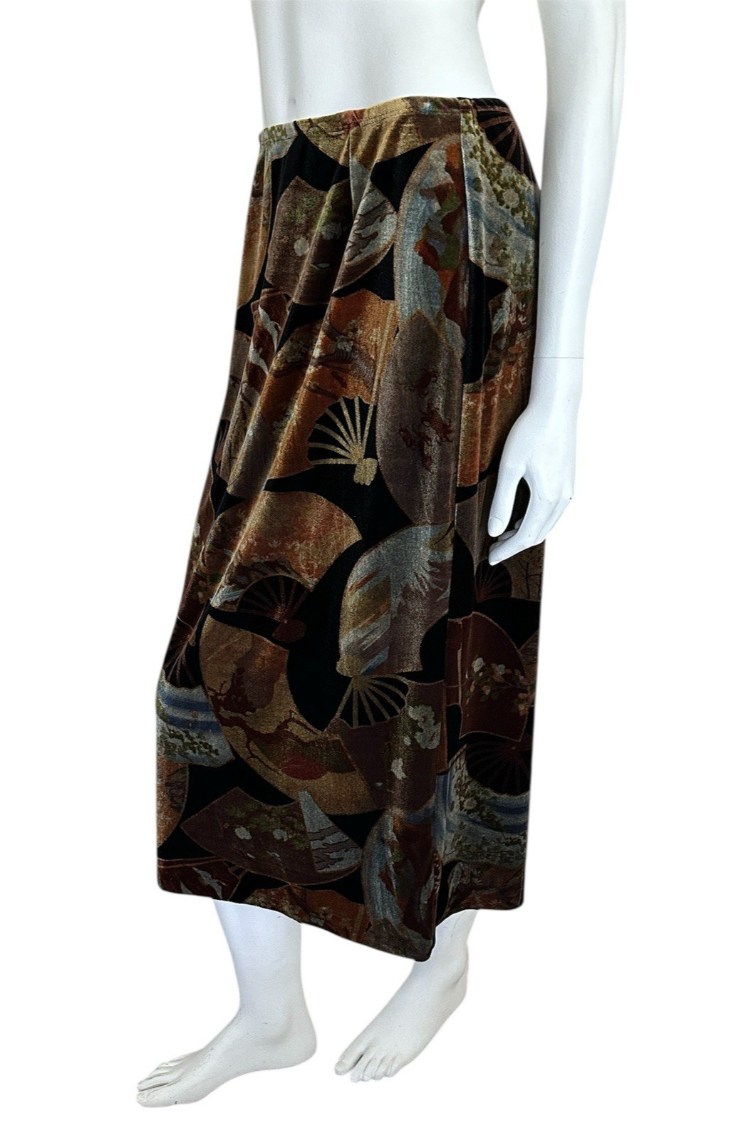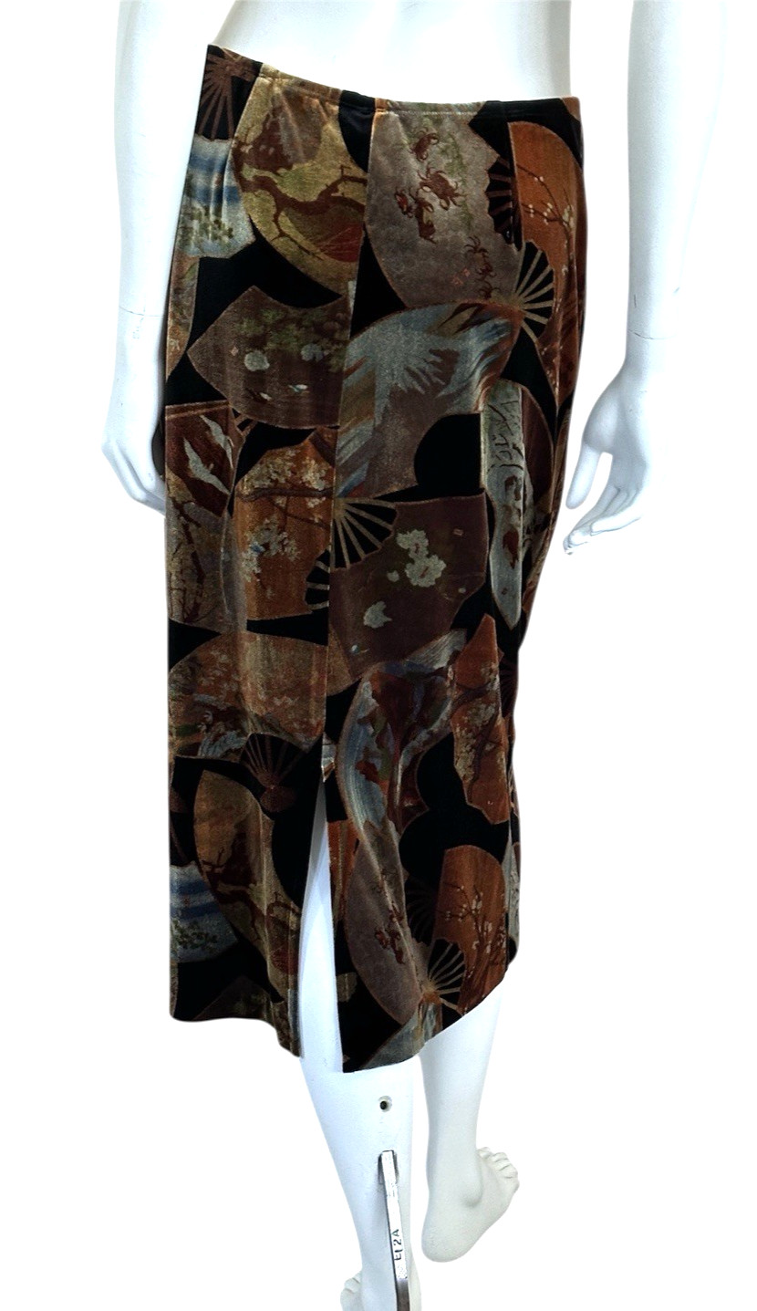 Vintage Clio Plush Velvet Midi Skirt Size M Fan Floral Japanese Asian Print Boho