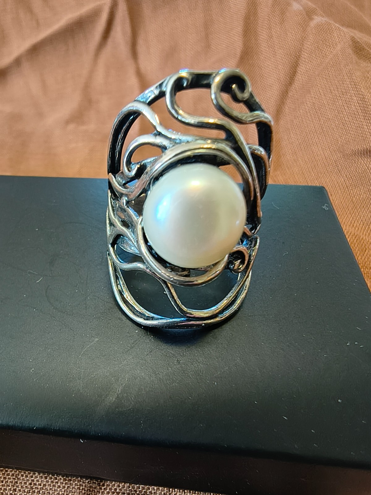 Israel Sterling Silver Wave Style With Pearl Center Ring Size 8 Length 1 1/4
