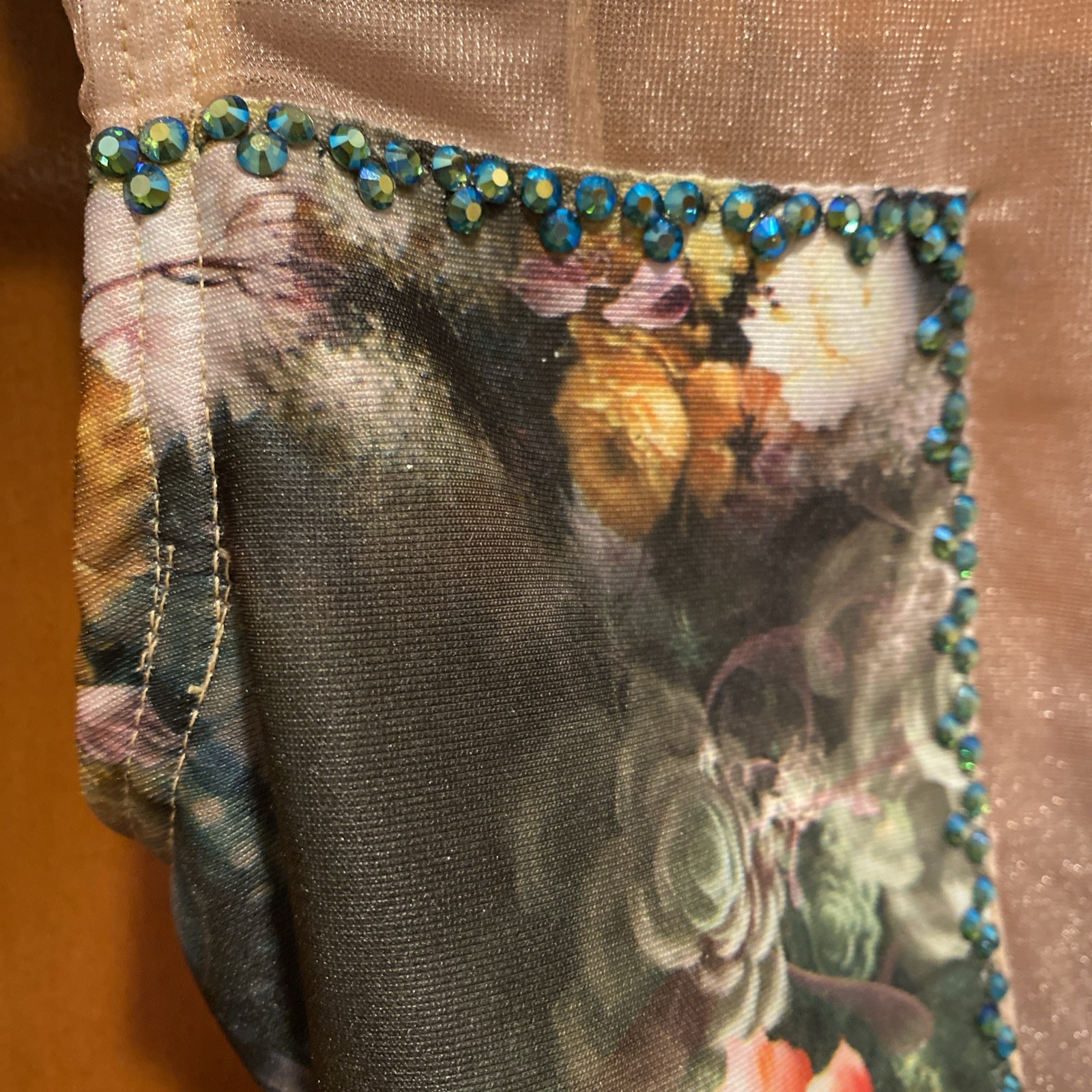 как выглядит Dark Green Floral and Gold Shimmer Mesh Children s Small Dance Costume Leotard фото
